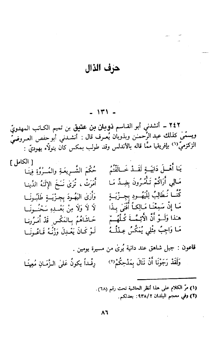 242 - أَنْشَدَنِي أَبُو الْقَاسِمِ ذَوْبَانُ بْنُ عَتِيقِ بْنِ تَمِيمٍ الْكَاتِبُ الْمَهْدَوِيُّ وَيُسَمَّى كَذَلِكَ عَبْدَ الرَّحْمَنِ وَبِذَوْبَانَ يُعْرَفُ قَالَ أَنْشَدَنِي أَبُو حَفْصٍ الْعَرُوضِيُّ الزَّكْزَمِيُّ بِإِفْرِيقِيَا مِمَّا قَالَهُ بِالْأَنْدَلُسِ وَقَدْ طُولِبَ بِمَكْسٍ كَانَ يَتَوَلَّاهُ يَهُودِيٌّ