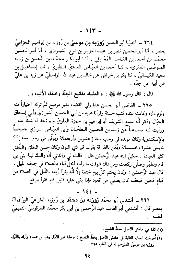 264 - أَخْبَرَنَا أَبُو الْحَسَنِ رُوزَبَهْ بْنُ مُوسَى بْنِ رُوزَبَهْ بْنِ إِبْرَاهِيمَ الْخُزَاعِيُّ بِمِصْرَ أَنَا أَبُو الْحُسَيْنِ نَصْرُ بْنُ عَبْدِ الْعَزِيزِ بْنِ نُوحٍ الشِّيرَازِيُّ أَنَا أَبُو الْحُسَيْنِ مُحَمَّدُ بْنُ أَحْمَدَ بْنِ الْقَاسِمِ الْمَحَامِلِيُّ أَنَا أَبُو بَكْرٍ مُحَمَّدُ بْنُ الْحَسَنِ بْنِ زِيَادٍ الْمَوْصِلِيُّ الْمُقْرِئُ ثَنَا أَحْمَدُ بْنُ الْعَبَّاسِ الْعَدَدِيُّ الطَّبَرِيُّ ثَنَا إِسْمَاعِيلُ بْنُ سَعِيدٍ الْكَيْسَانِيُّ ثَنَا بَكْرُ بْنُ خِرَاشٍ عَنْ خَالِدِ بْنِ عَبْدِ اللَّهِ الْوَاسِطِيِّ عَنْ زَيْدِ بْنِ عَلِيٍّ عَنْ أَبِيهِ عَنْ جَدِّهِ