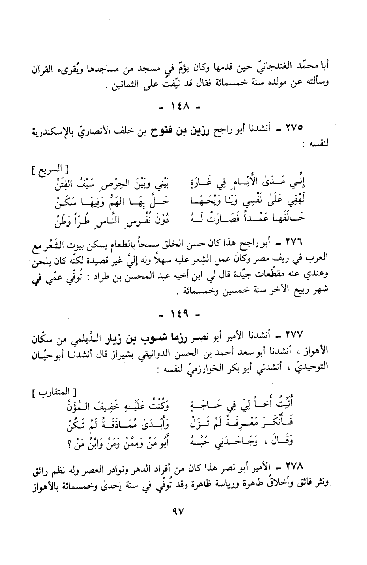 277 - أَنْشَدَنَا الْأَمِيرُ أَبُو نَصْرٍ رَزْمَا شُوبَ بْنُ زَيَارٍ الدَّيْلَمِيُّ مِنْ سُكَّانِ الْأَهْوَازِ أَنْشَدَنَا أَبُو سَعْدٍ أَحْمَدُ بْنُ الْحَسَنِ الدَّوَانِيقِيُّ بِشِيرَازَ قَالَ أَنْشَدَنَا أَبُو حَيَّانَ التَّوْحِيدِيُّ أَنْشَدَنِي أَبُو بَكْرٍ الْخُوَارِزْمِيُّ لِنَفْسِهِ