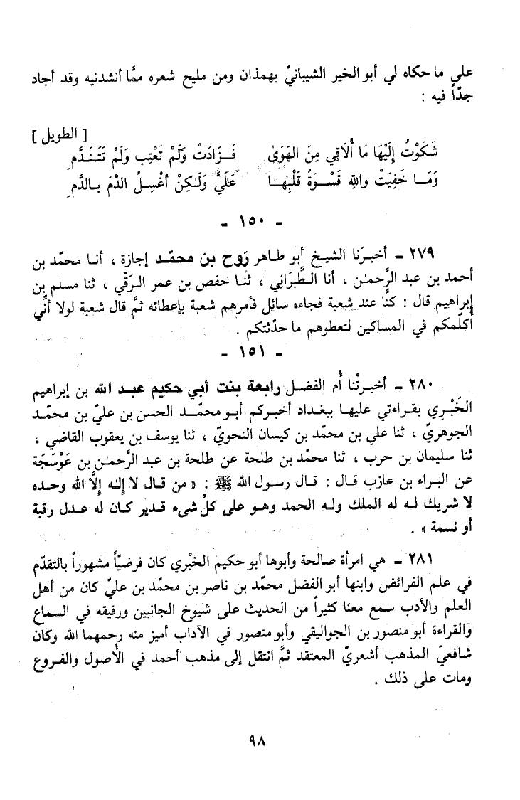 280 - أَخْبَرَتْنَا أُمُّ الْفَضْلِ رَابِعَةُ بِنْتُ أَبِي حَكِيمٍ عَبْدِ اللَّهِ بْنِ إِبْرَاهِيمَ الْخَبْرِيِّ بِقِرَاءَتِي عَلَيْهَا بِبَغْدَادَ أَخْبَرَكُمْ أَبُو مُحَمَّدٍ الْحَسَنُ بْنُ عَلِيِّ بْنِ مُحَمَّدٍ الْجَوْهَرِيُّ ثَنَا عَلِيُّ بْنُ مُحَمَّدِ بْنِ كَيْسَانَ النَّحْوِيُّ ثَنَا يُوسُفُ بْنُ يَعْقُوبَ الْقَاضِي ثَنَا سُلَيْمَانُ بْنُ حَرْبٍ ثَنَا مُحَمَّدُ بْنُ طَلْحَةَ عَنْ طَلْحَةَ بْنِ عَبْدِ الرَّحْمَنِ بْنِ عَوْسَجَةَ عَنِ الْبَرَاءِ بْنِ عَازِبٍ قَالَ قَالَ رَسُولُ اللَّهِ صَلَّى اللَّهُ عَلَيْهِ وَسَلَّمَ مَنْ قَالَ لَا إِلَهَ إِلَّا اللَّهُ وَحده لَا شريك لَهُ الْمُلْكُ وَلَهُ الْحَمْدُ وَهُوَ عَلَى كُلِّ شَيْءٍ قَدِيرٌ كَانَ لَهُ عَدْلُ رَقَبَةٍ أَوْ نَسَمَةٍ