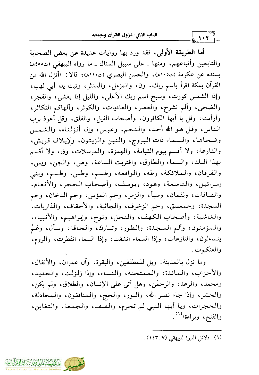 أما الطريقة الأولى، فقد ورد بها روايات عديدة عن بعض الصحابة والتابعين وأتباعهم، ومنها ـ على سبيل المثال ـ ما رواه البيهقي (ت458هـ) بسنده عن عكرمة (ت105هـ)، والحسن البصري (ت110هـ)؛ قالا: «أنزل الله من القرآن بمكة اقرأ باسم ربك، ون، والمزمل، والمدثر، وتبت يدا أبي لهب، وإذا الشمس كورت، وسبح اسم ربك الأعلى، والليل إذا يغشى، والفجر، والضحى، وألم نشرح، والعصر، والعاديات، والكوثر، وألهاكم التكاثر، وأرأيت، وقل يا أيها الكافرون، وأصحاب الفيل، والفلق، وقل أعوذ برب الناس، وقل هو الله أحد، والنجم، وعبس، وإنا أنزلناه، والشمس وضحاها، والسماء ذات البروج، والتين والزيتون، ولإيلاف قريش، والقارعة، ولا أقسم بيوم القيامة، والهمزة، والمرسلات، وق، ولا أقسم بهذا البلد، والسماء والطارق، واقتربت الساعة، وص، والجن، ويس، والفرقان، والملائكة، وطه، والواقعة، وطسم، وطس، وطسم، وبني إسرائيل، والتاسعة، وهود، ويوسف، وأصحاب الحجر، والأنعام، والصافات، ولقمان، وسبأ، والزمر، وحم المؤمن، وحم الدخان، وحم السجدة، وحمعسق، وحم الزخرف، والجاثية، والأحقاف، والذاريات، والغاشية، وأصحاب الكهف، والنحل، ونوح، وإبراهيم، والأنبياء، والمؤمنون، وآلم السجدة، والطور، وتبارك، والحاقة، وسأل، وعَمَّ يتساءلون، والنازعات، وإذا السماء انشقت، وإذا السماء انفطرت، والروم، والعنكبوت.