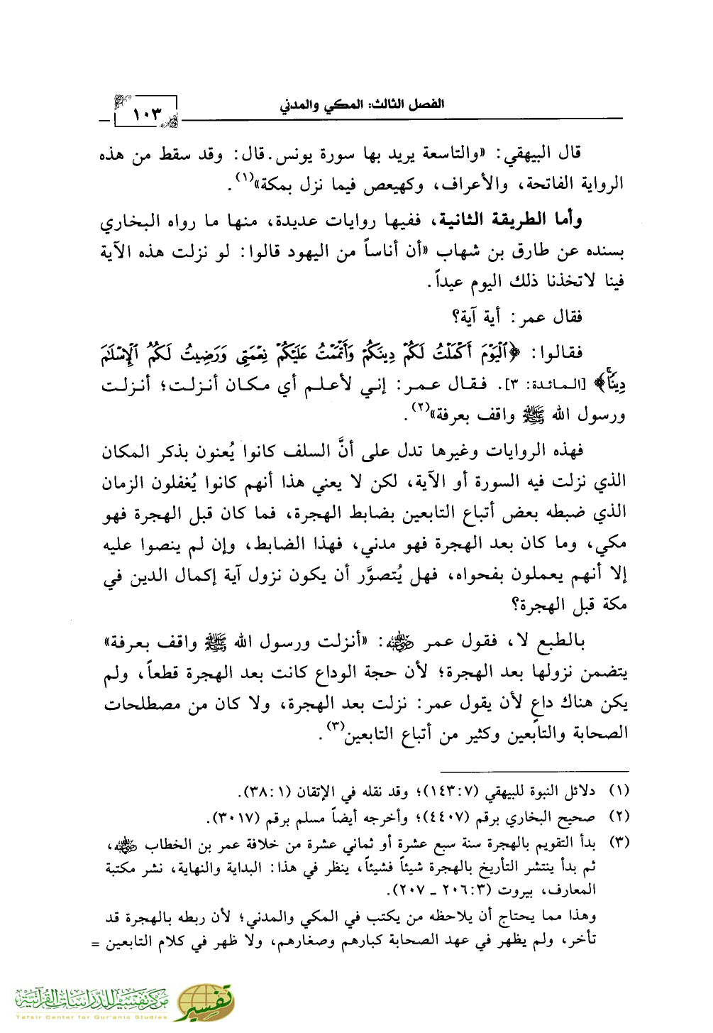 فهذه الروايات وغيرها تدل على أنَّ السلف كانوا يُعنون بذكر المكان الذي نزلت فيه السورة أو الآية، لكن لا يعني هذا أنهم كانوا يُغفلون الزمان الذي ضبطه بعض أتباع التابعين بضابط الهجرة، فما كان قبل الهجرة فهو مكي، وما كان بعد الهجرة فهو مدني، فهذا الضابط، وإن لم ينصوا عليه إلا أنهم يعملون بفحواه، فهل يُتصوَّر أن يكون نزول آية إكمال الدين في مكة قبل الهجرة؟