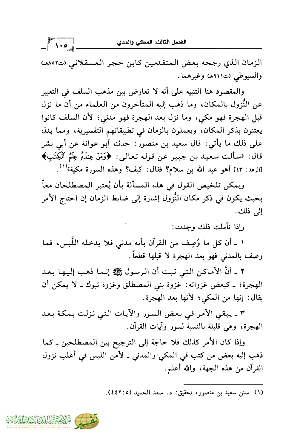 والمقصود هنا التنبيه على أنه لا تعارض بين مذهب السلف في التعبير عن النُّزول بالمكان، وما ذهب إليه المتأخرون من العلماء من أن ما نزل قبل الهجرة فهو مكي، وما نزل بعد الهجرة فهو مدني؛ لأن السلف كانوا يعتنون بذكر المكان، ويعملون بالزمان في تطبيقاتهم التفسيرية، ومما يدل على ذلك ما يأتي: قال سعيد بن منصور: حدثنا أبو عوانة عن أبي بشر قال: «سألت سعيد بن جبير عن قوله تعالى: {وَمَنْ عِنْدَهُ عِلْمُ الْكِتَابِ} [الرعد: 43] أهو عبد الله بن سلام؟ فقال: كيف؟ وهذه السورة مكية» (¬1).