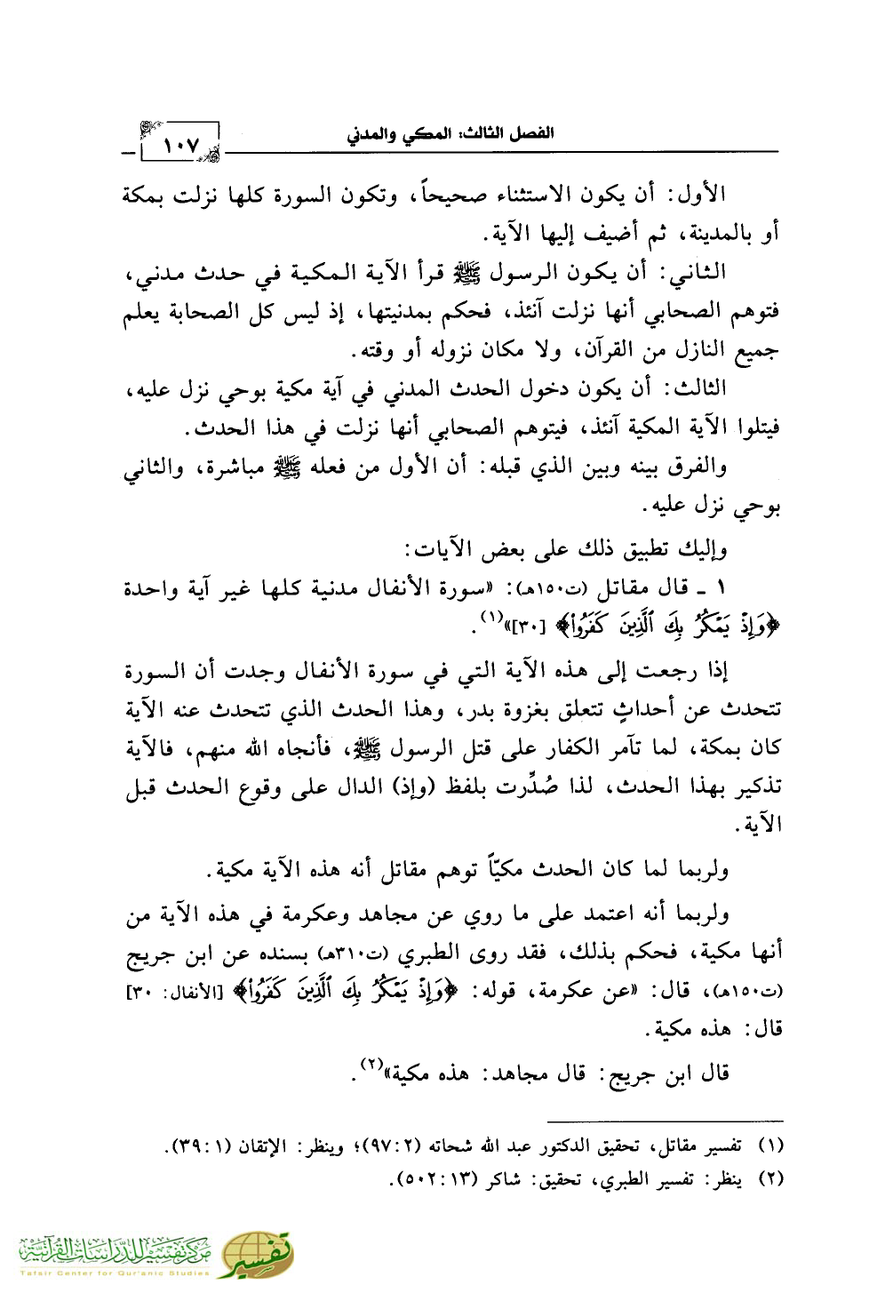 1 - قال مقاتل (ت150هـ): «سورة الأنفال مدنية كلها غير آية واحدة {وَإِذْ يَمْكُرُ بِكَ الَّذِينَ كَفَرُوا} [30]» (¬1).
