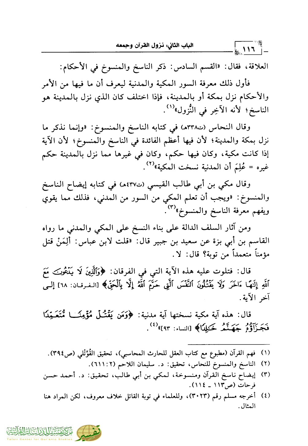 وقال مكي بن أبي طالب القيسي (ت437هـ) في كتابه إيضاح الناسخ والمنسوخ: «ويجب أن تعلم المكي من السور من المدني، فذلك مما يقوي ويفهم معرفة الناسخ والمنسوخ» (¬3).