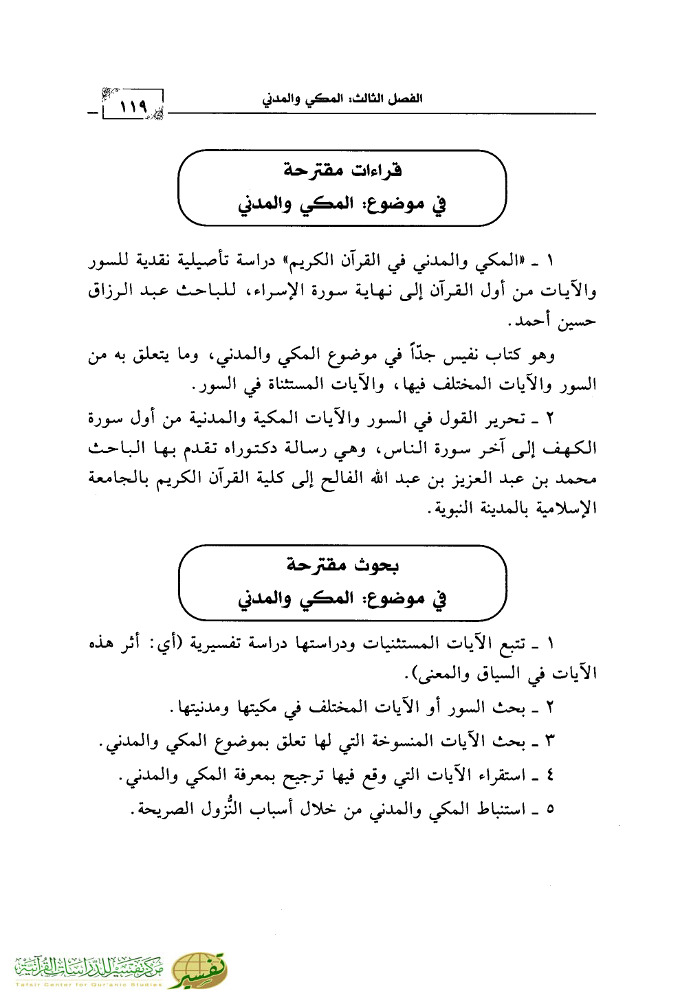 1 - «المكي والمدني في القرآن الكريم» دراسة تأصيلية نقدية للسور والآيات من أول القرآن إلى نهاية سورة الإسراء، للباحث عبد الرزاق حسين أحمد.
