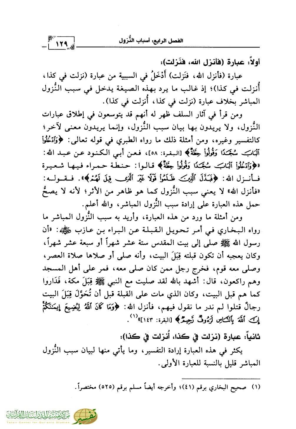 ومن أمثلة ما ورد من هذه العبارة، وأريد به سبب النُّزول المباشر ما رواه البخاري في أمر تحويل القبلة عن البراء بن عازب رضي الله عنه: «أن رسول الله صلّى الله عليه وسلّم صلى إلى بيت المقدس ستة عشر شهراً أو سبعة عشر شهراً، وكان يعجبه أن تكون قبلته قِبَلَ البيت، وأنه صلى أو صلاها صلاة العصر، وصلى معه قوم، فخرج رجل ممن كان صلى معه، فمر على أهل المسجد وهم راكعون، قال: أشهد بالله لقد صليت مع النبي صلّى الله عليه وسلّم قِبَلَ مكة، فَدَاروا كما هم قبل البيت، وكان الذي مات على القبلة قبل أن تُحَوَّلَ قِبَلَ البيت رجالٌ قتلوا لم ندر ما نقول فيهم، فأنزل الله: {وَمَا كَانَ اللَّهُ لِيُضِيعَ إِيمَانَكُمْ إِنْ اللَّهَ بِالنَّاسِ لَرَؤُوفٌ رَحِيمٌ} [البقرة: 143]» (¬1).