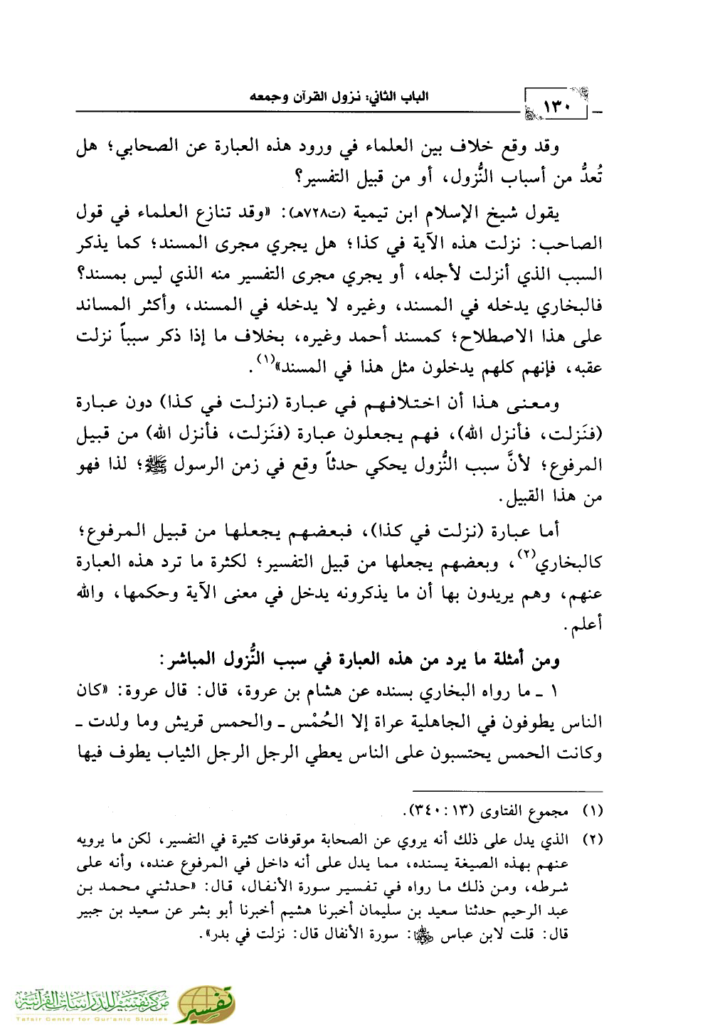 ومعنى هذا أن اختلافهم في عبارة (نزلت في كذا) دون عبارة (فنَزلت، فأنزل الله)، فهم يجعلون عبارة (فنَزلت، فأنزل الله) من قبيل المرفوع؛ لأنَّ سبب النُّزول يحكي حدثاً وقع في زمن الرسول صلّى الله عليه وسلّم؛ لذا فهو من هذا القبيل.