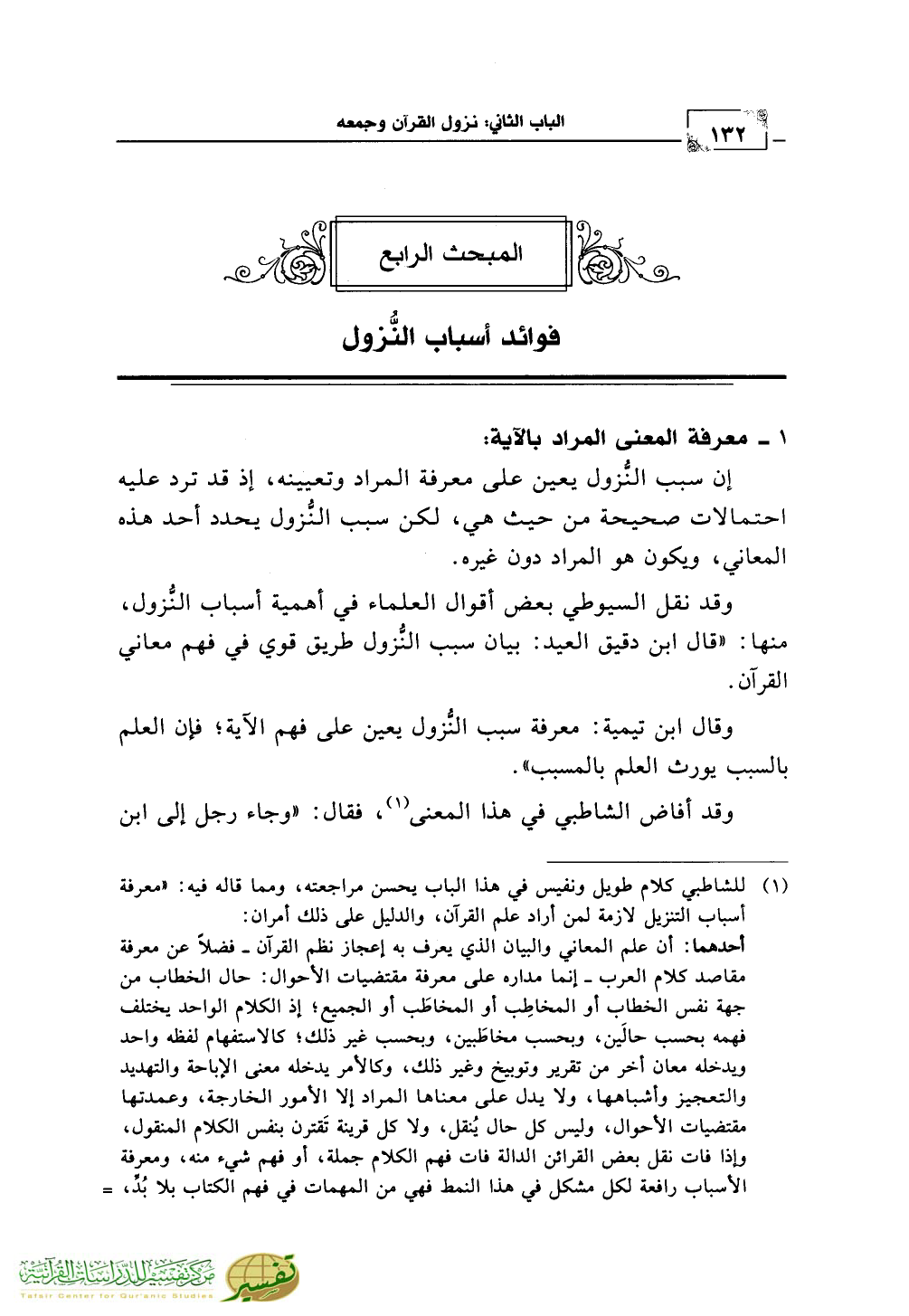 (¬1) للشاطبي كلام طويل ونفيس في هذا الباب يحسن مراجعته، ومما قاله فيه: «معرفة أسباب التنزيل لازمة لمن أراد علم القرآن، والدليل على ذلك أمران: