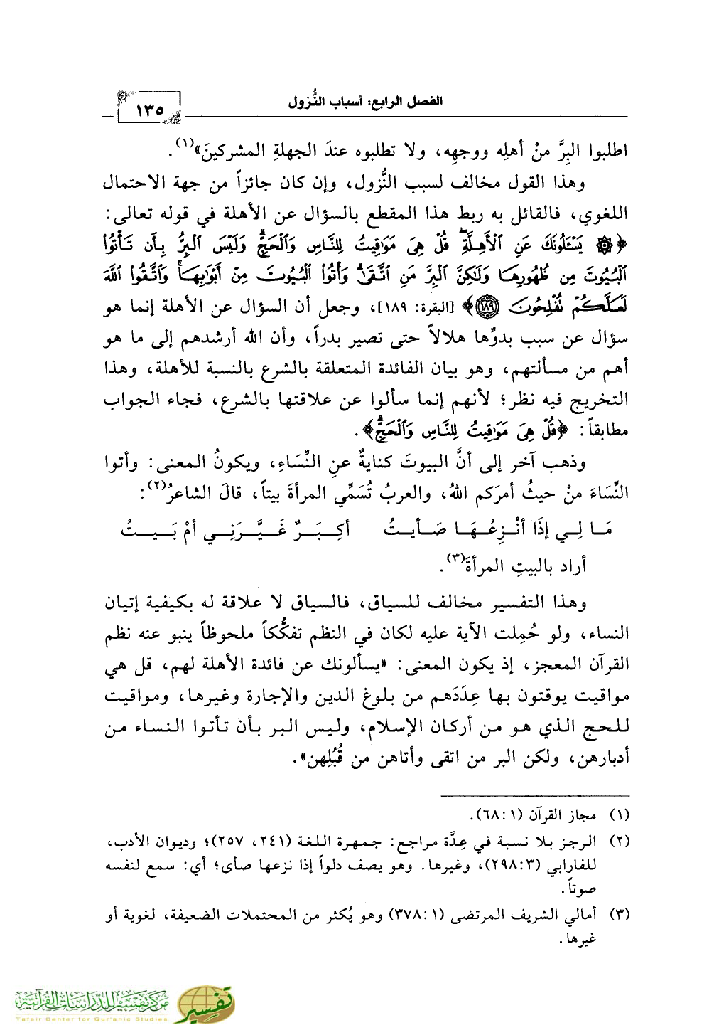 وهذا القول مخالف لسبب النُّزول، وإن كان جائزاً من جهة الاحتمال اللغوي، فالقائل به ربط هذا المقطع بالسؤال عن الأهلة في قوله تعالى: {يَسْأَلُونَكَ عَنِ الأَهِلَّةِ قُلْ هِيَ مَوَاقِيتُ لِلنَّاسِ وَالْحَجِّ وَلَيْسَ الْبِرُّ بِأَنْ تَاتُوا الْبُيُوتَ مِنْ ظُهُورِهَا وَلَكِنَّ الْبِرَّ مَنِ اتَّقَى وَاتُوا الْبُيُوتَ مِنْ أَبْوَابِهَا وَاتَّقُوا اللَّهَ لَعَلَّكُمْ تُفْلِحُونَ} [البقرة: 189]، وجعل أن السؤال عن الأهلة إنما هو سؤال عن سبب بدوِّها هلالاً حتى تصير بدراً، وأن الله أرشدهم إلى ما هو أهم من مسألتهم، وهو بيان الفائدة المتعلقة بالشرع بالنسبة للأهلة، وهذا التخريج فيه نظر؛ لأنهم إنما سألوا عن علاقتها بالشرع، فجاء الجواب مطابقاً: {قُلْ هِيَ مَوَاقِيتُ لِلنَّاسِ وَالْحَجِّ}.