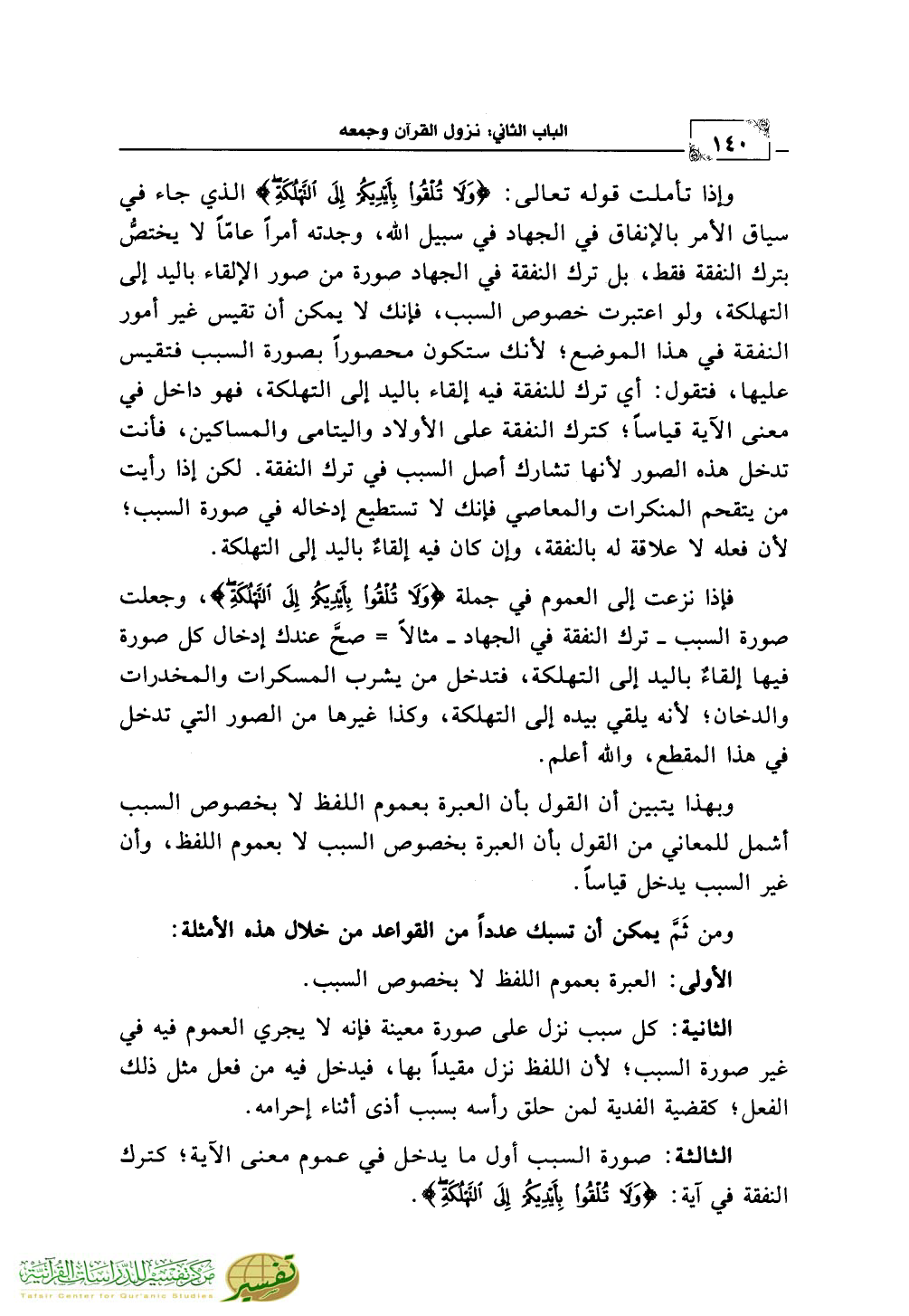وإذا تأملت قوله تعالى: {وَلاَ تُلْقُوا بِأَيْدِيكُمْ إِلَى التَّهْلُكَةِ} الذي جاء في سياق الأمر بالإنفاق في الجهاد في سبيل الله، وجدته أمراً عامّاً لا يختصُّ بترك النفقة فقط، بل ترك النفقة في الجهاد صورة من صور الإلقاء باليد إلى التهلكة، ولو اعتبرت خصوص السبب، فإنك لا يمكن أن تقيس غير أمور النفقة في هذا الموضع؛ لأنك ستكون محصوراً بصورة السبب فتقيس عليها، فتقول: أي ترك للنفقة فيه إلقاء باليد إلى التهلكة، فهو داخل في معنى الآية قياساً؛ كترك النفقة على الأولاد واليتامى والمساكين، فأنت تدخل هذه الصور لأنها تشارك أصل السبب في ترك النفقة. لكن إذا رأيت من يتقحم المنكرات والمعاصي فإنك لا تستطيع إدخاله في صورة السبب؛ لأن فعله لا علاقة له بالنفقة، وإن كان فيه إلقاءٌ باليد إلى التهلكة.