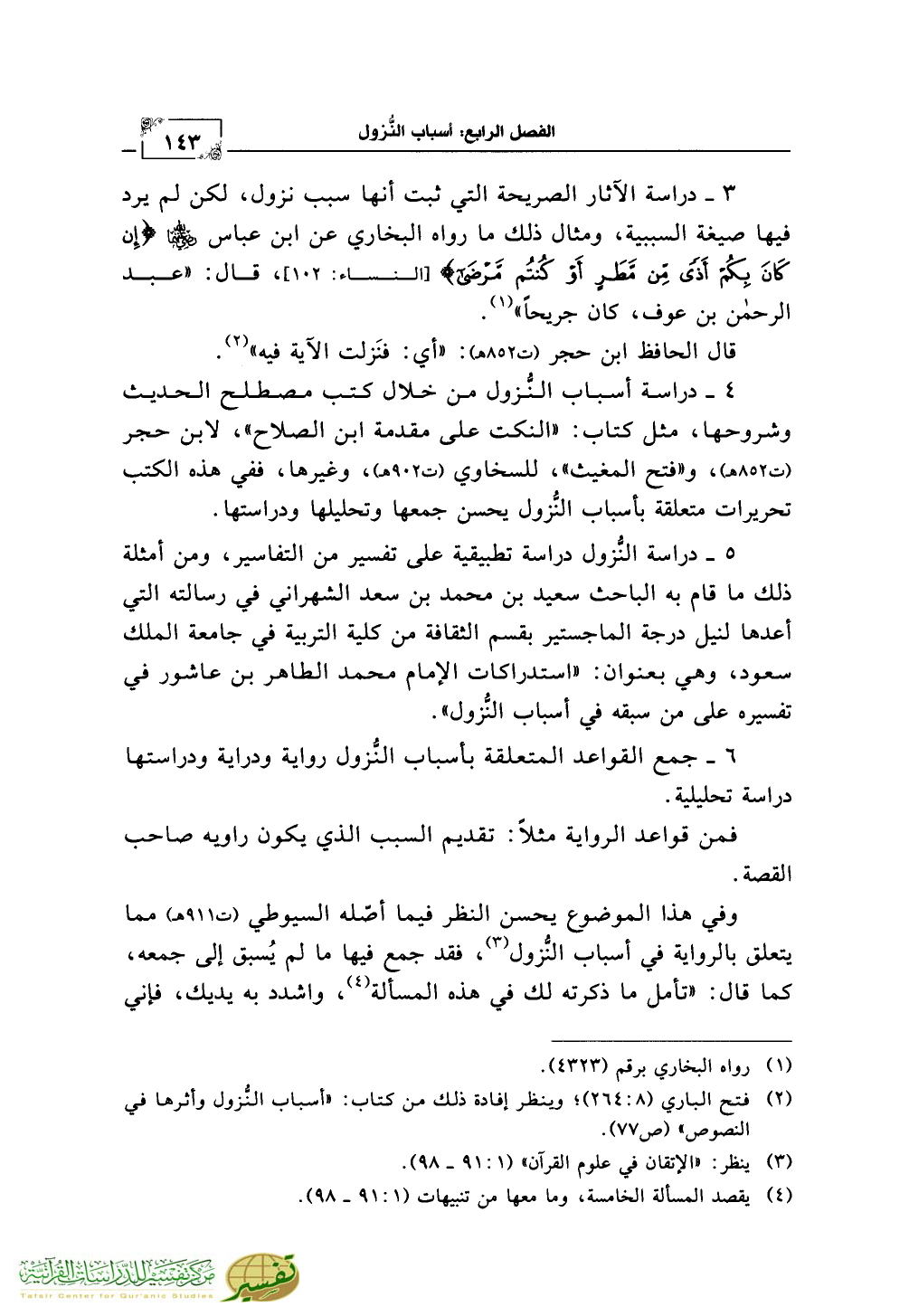 3 - دراسة الآثار الصريحة التي ثبت أنها سبب نزول، لكن لم يرد فيها صيغة السببية، ومثال ذلك ما رواه البخاري عن ابن عباس رضي الله عنهما {إِنْ كَانَ بِكُمْ أَذىً مِنْ مَطَرٍ أَوْ كُنْتُمْ مَرْضَى} [النساء: 102]، قال: «عبد الرحمن بن عوف، كان جريحاً» (¬1).