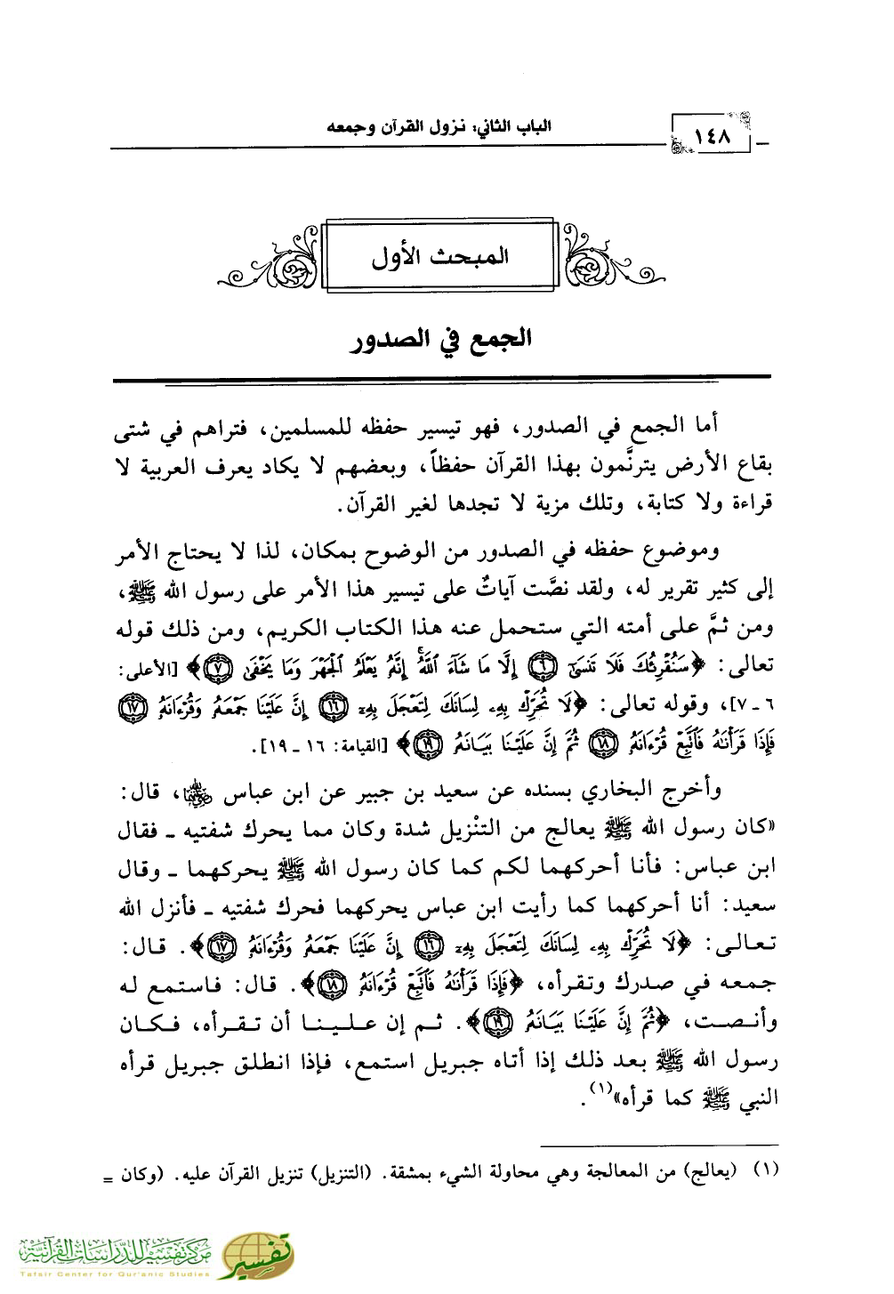 وأخرج البخاري بسنده عن سعيد بن جبير عن ابن عباس رضي الله عنهما، قال: «كان رسول الله صلّى الله عليه وسلّم يعالج من التنْزيل شدة وكان مما يحرك شفتيه ـ فقال ابن عباس: فأنا أحركهما لكم كما كان رسول الله صلّى الله عليه وسلّم يحركهما ـ وقال سعيد: أنا أحركهما كما رأيت ابن عباس يحركهما فحرك شفتيه ـ فأنزل الله تعالى: {لاَ تُحَرِّكْ بِهِ لِسَانَكَ لِتَعْجَلَ بِهِ *إِنَّ عَلَيْنَا جَمْعَهُ وَقُرْآنَهُ}. قال: جمعه في صدرك وتقرأه، {فَإِذَا قَرَانَاهُ فَاتَّبِعْ قُرْآنَهُ}. قال: فاستمع له وأنصت، {ثُمَّ إِنَّ عَلَيْنَا بَيَانَهُ}. ثم إن علينا أن تقرأه، فكان رسول الله صلّى الله عليه وسلّم بعد ذلك إذا أتاه جبريل استمع، فإذا انطلق جبريل قرأه النبي صلّى الله عليه وسلّم كما قرأه» (¬1).
