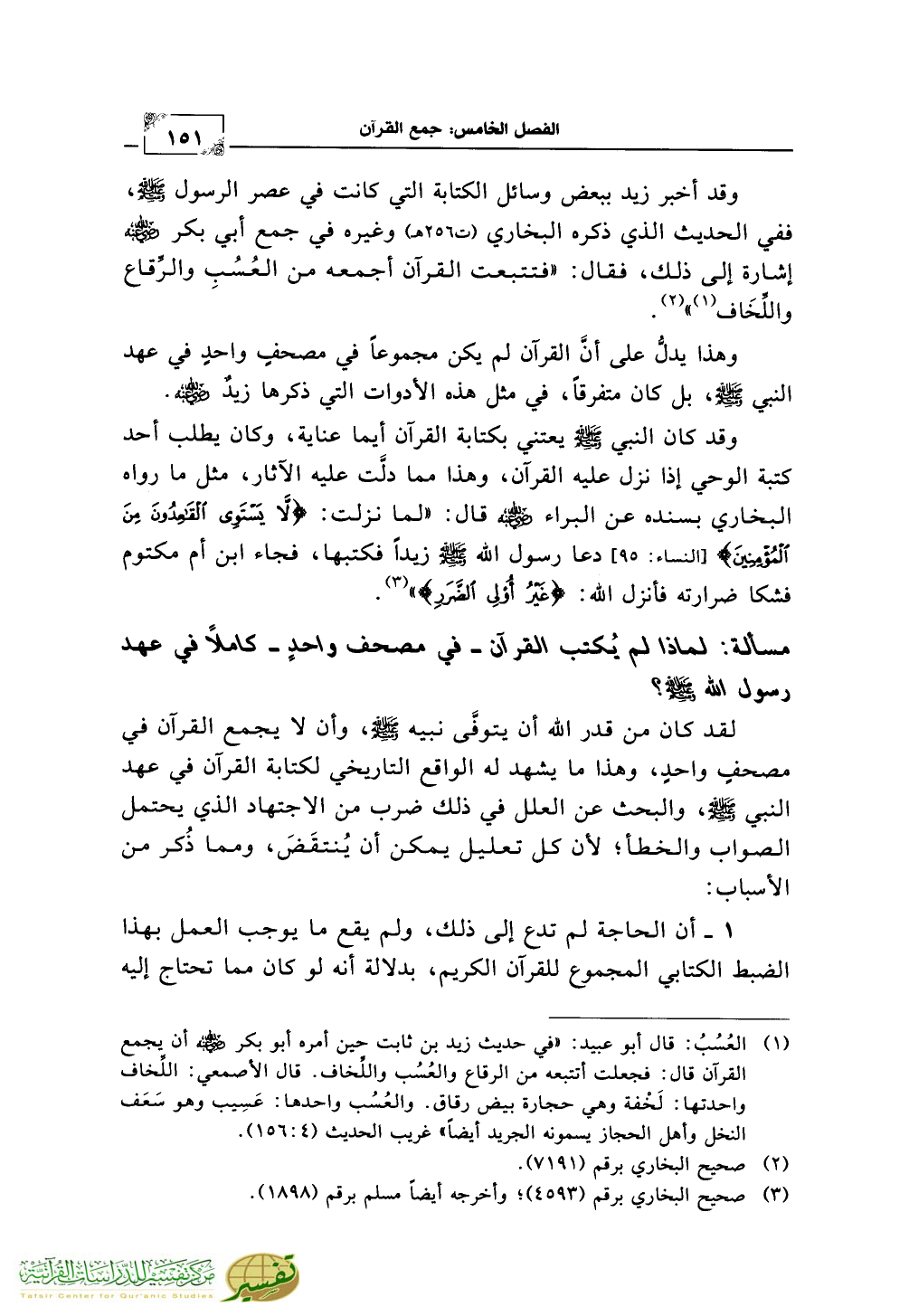 وقد كان النبي صلّى الله عليه وسلّم يعتني بكتابة القرآن أيما عناية، وكان يطلب أحد كتبة الوحي إذا نزل عليه القرآن، وهذا مما دلَّت عليه الآثار، مثل ما رواه البخاري بسنده عن البراء رضي الله عنه قال: «لما نزلت: {لاَ يَسْتَوِي الْقَاعِدُونَ مِنَ الْمُؤْمِنِينَ} [النساء: 95] دعا رسول الله صلّى الله عليه وسلّم زيداً فكتبها، فجاء ابن أم مكتوم فشكا ضرارته فأنزل الله: {غَيْرُ أُوْلِي الضَّرَرِ}» (¬3).
