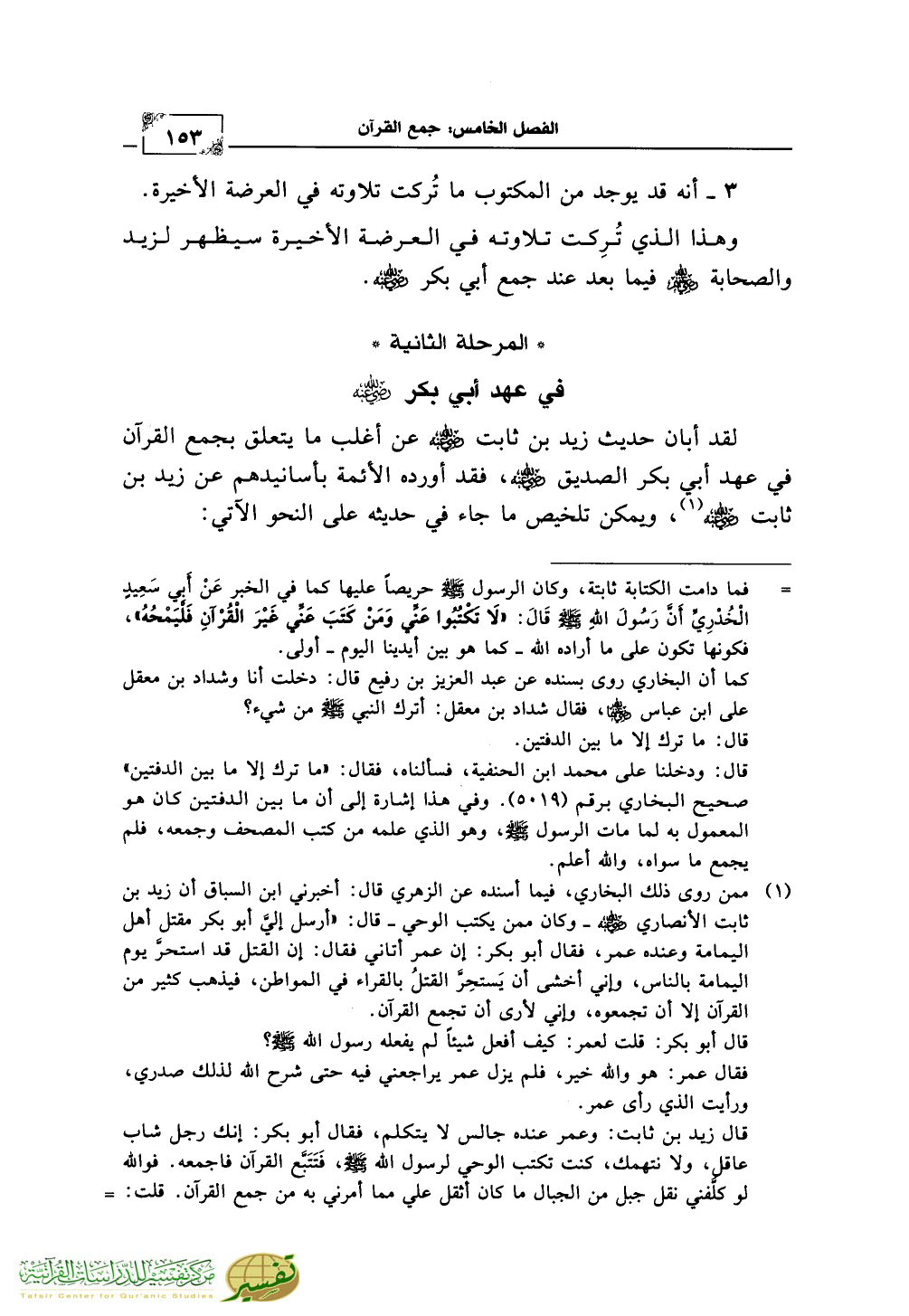 (¬1) ممن روى ذلك البخاري، فيما أسنده عن الزهري قال: أخبرني ابن السباق أن زيد بن ثابت الأنصاري رضي الله عنه ـ وكان ممن يكتب الوحي ـ قال: «أرسل إليَّ أبو بكر مقتل أهل اليمامة وعنده عمر، فقال أبو بكر: إن عمر أتاني فقال: إن القتل قد استحرَّ يوم اليمامة بالناس، وإني أخشى أن يَستحِرَّ القتلُ بالقراء في المواطن، فيذهب كثير من القرآن إلا أن تجمعوه، وإني لأرى أن تجمع القرآن.