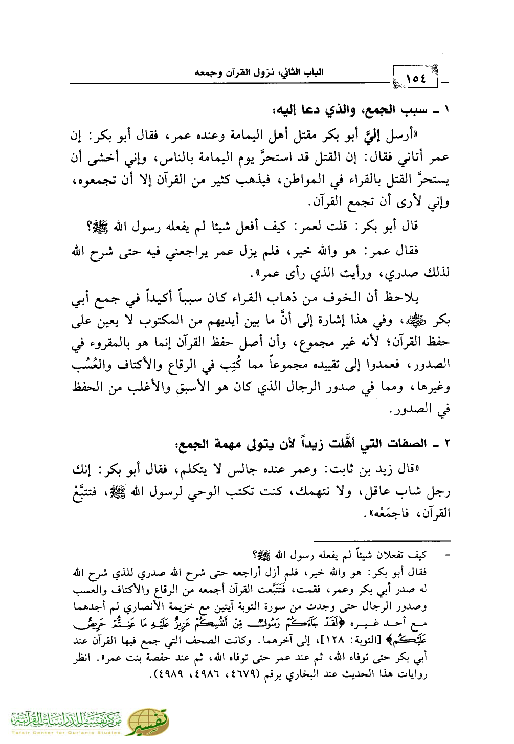 فقال أبو بكر: هو والله خير، فلم أزل أراجعه حتى شرح الله صدري للذي شرح الله له صدر أبي بكر وعمر، فقمت، فَتَتَبَّعت القرآن أجمعه من الرقاع والأكتاف والعسب وصدور الرجال حتى وجدت من سورة التوبة آيتين مع خزيمة الأنصاري لم أجدهما مع أحد غيره {لَقَدْ جَاءَكُمْ رَسُولٌ مِنْ أَنْفُسِكُمْ عَزِيزٌ عَلَيْهِ مَا عَنِتُّمْ حَرِيصٌ عَلَيْكُمْ} [التوبة: 128]، إلى آخرهما. وكانت الصحف التي جمع فيها القرآن عند أبي بكر حتى توفاه الله، ثم عند عمر حتى توفاه الله، ثم عند حفصة بنت عمر». انظر روايات هذا الحديث عند البخاري برقم (4679، 4986، 4989).