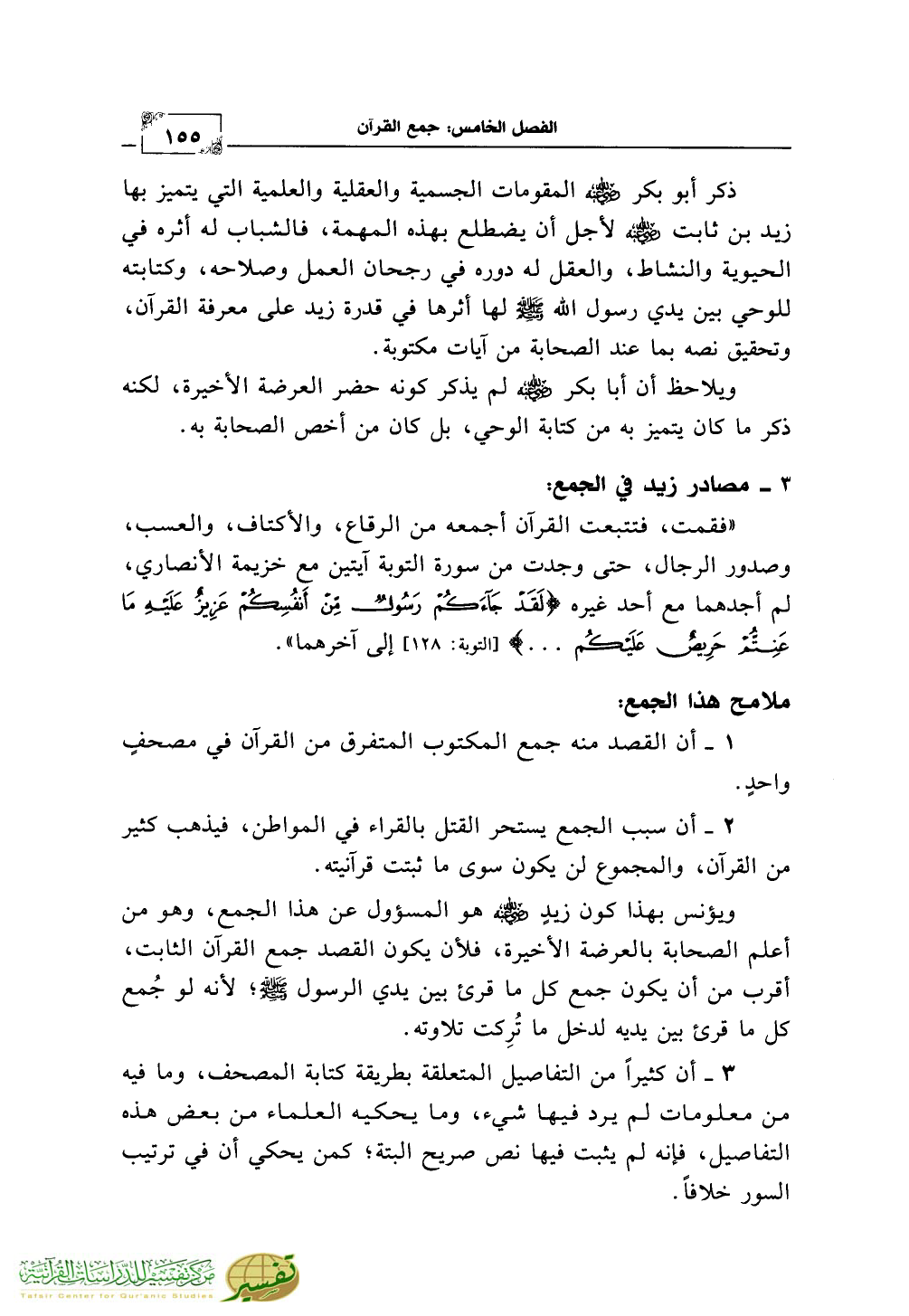 2 - أن سبب الجمع يستحر القتل بالقراء في المواطن، فيذهب كثير من القرآن، والمجموع لن يكون سوى ما ثبتت قرآنيته.