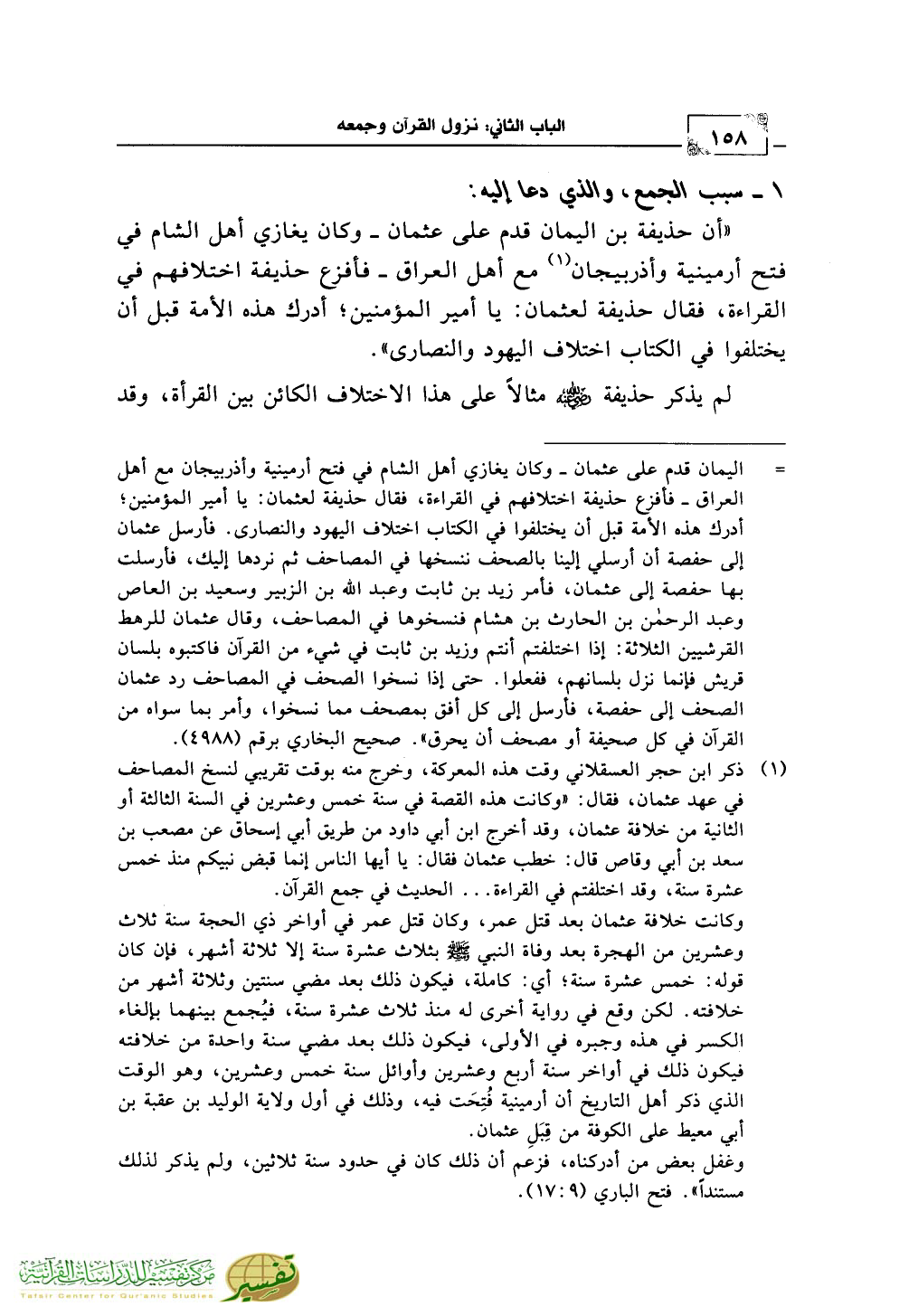 = اليمان قدم على عثمان ـ وكان يغازي أهل الشام في فتح أرمينية وأذربيجان مع أهل العراق ـ فأفزع حذيفة اختلافهم في القراءة، فقال حذيفة لعثمان: يا أمير المؤمنين؛ أدرك هذه الأمة قبل أن يختلفوا في الكتاب اختلاف اليهود والنصارى. فأرسل عثمان إلى حفصة أن أرسلي إلينا بالصحف ننسخها في المصاحف ثم نردها إليك، فأرسلت بها حفصة إلى عثمان، فأمر زيد بن ثابت وعبد الله بن الزبير وسعيد بن العاص وعبد الرحمن بن الحارث بن هشام فنسخوها في المصاحف، وقال عثمان للرهط القرشيين الثلاثة: إذا اختلفتم أنتم وزيد بن ثابت في شيء من القرآن فاكتبوه بلسان قريش فإنما نزل بلسانهم، ففعلوا. حتى إذا نسخوا الصحف في المصاحف رد عثمان الصحف إلى حفصة، فأرسل إلى كل أفق بمصحف مما نسخوا، وأمر بما سواه من القرآن في كل صحيفة أو مصحف أن يحرق». صحيح البخاري برقم (4988).