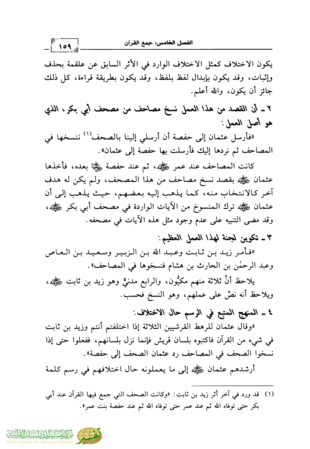 «وقال عثمان للرهط القرشيين الثلاثة إذا اختلفتم أنتم وزيد بن ثابت في شيء من القرآن فاكتبوه بلسان قريش فإنما نزل بلسانهم، ففعلوا حتى إذا نسخوا الصحف في المصاحف رد عثمان الصحف إلى حفصة».