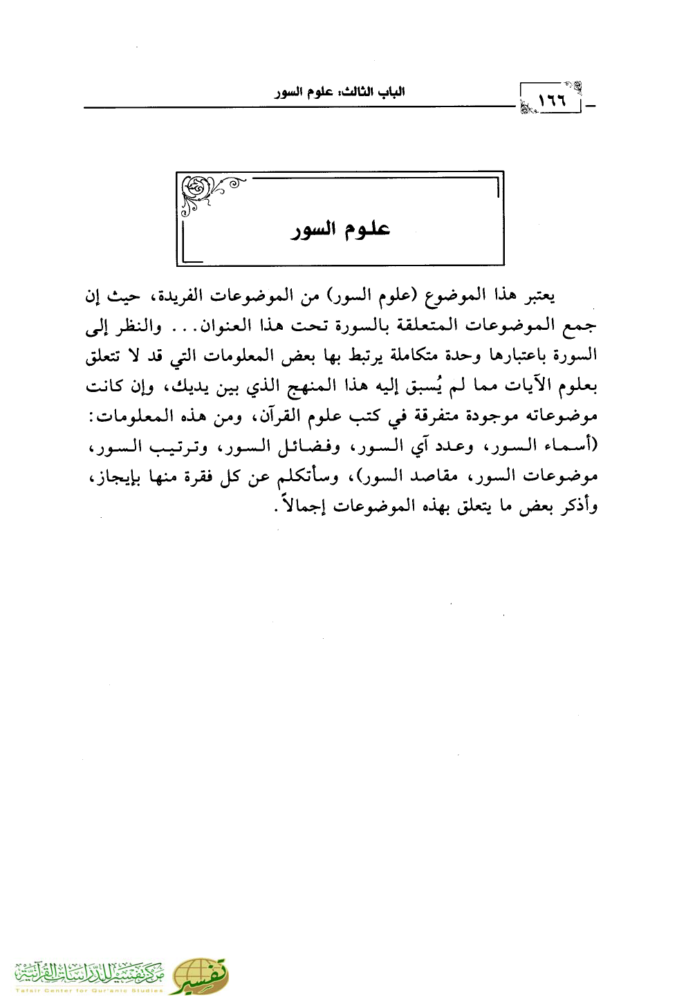 يعتبر هذا الموضوع (علوم السور) من الموضوعات الفريدة، حيث إن جمع الموضوعات المتعلقة بالسورة تحت هذا العنوان ... والنظر إلى السورة باعتبارها وحدة متكاملة يرتبط بها بعض المعلومات التي قد لا تتعلق بعلوم الآيات مما لم يُسبق إليه هذا المنهج الذي بين يديك، وإن كانت موضوعاته موجودة متفرقة في كتب علوم القرآن، ومن هذه المعلومات: (أسماء السور، وعدد آي السور، وفضائل السور، وترتيب السور، موضوعات السور، مقاصد السور)، وسأتكلم عن كل فقرة منها بإيجاز، وأذكر بعض ما يتعلق بهذه الموضوعات إجمالاً.