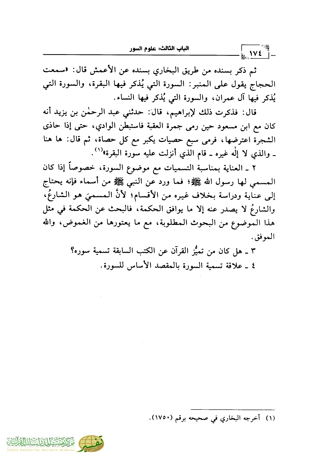2 - العناية بمناسبة التسميات مع موضوع السورة، خصوصاً إذا كان المسمي لها رسول الله صلّى الله عليه وسلّم؛ فما ورد عن النبي صلّى الله عليه وسلّم من أسماء فإنه يحتاج إلى عناية ودراسة بخلاف غيره من الأقسام؛ لأنَّ المسميَ هو الشارعُ، والشارعُ لا يصدر عنه إلا ما يوافق الحكمة، فالبحث عن الحكمة في مثل هذا الموضوع من البحوث المطلوبة، مع ما يعتورها من الغموض، والله الموفق.