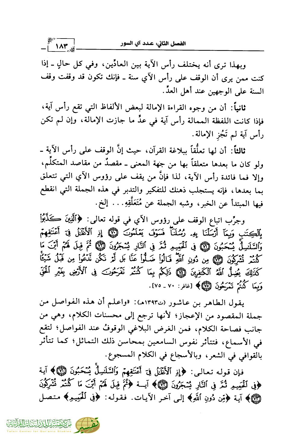 يقول الطاهر بن عاشور (ت1393هـ): «واعلم أن هذه الفواصل من جملة المقصود من الإعجاز؛ لأنها ترجع إلى محسنات الكلام، وهي من جانب فصاحة الكلام، فمن الغرض البلاغي الوقوفُ عند الفواصل؛ لتقع في الأسماع، فتتأثر نفوس السامعين بمحاسن ذلك التماثل؛ كما تتأثر بالقوافي في الشعر، وبالأسجاع في الكلام المسجوع.