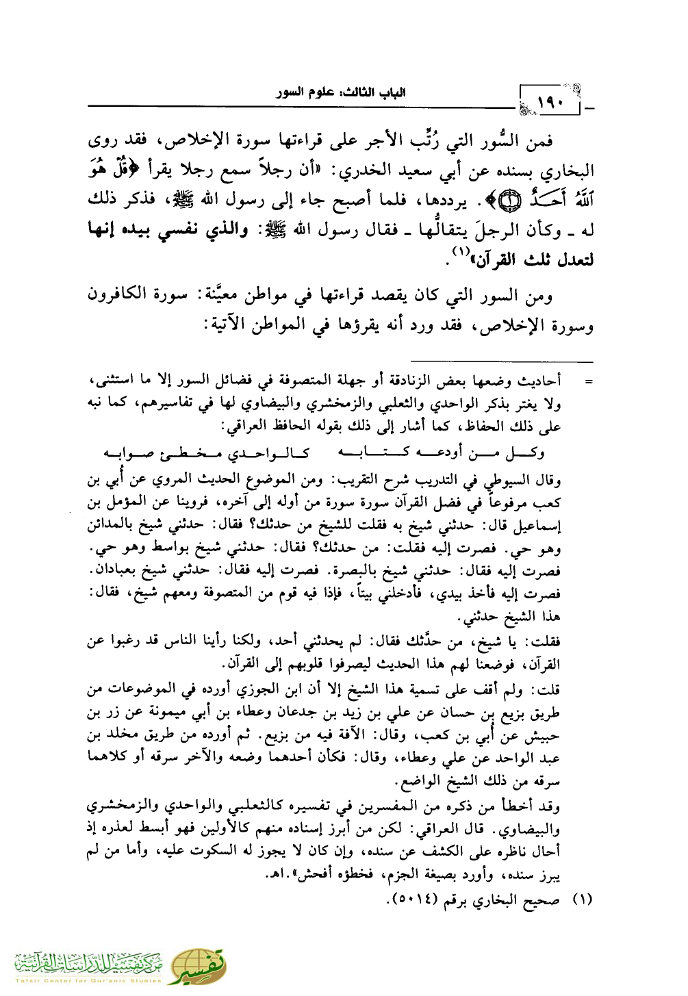 فمن السُّور التي رُتِّب الأجر على قراءتها سورة الإخلاص، فقد روى البخاري بسنده عن أبي سعيد الخدري: «أن رجلاً سمع رجلا يقرأ {قُلْ هُوَ اللَّهُ أَحَدٌ}. يرددها، فلما أصبح جاء إلى رسول الله صلّى الله عليه وسلّم، فذكر ذلك له ـ وكأن الرجلَ يتقالُّها ـ فقال رسول الله صلّى الله عليه وسلّم: والذي نفسي بيده إنها لتعدل ثلث القرآن» (¬1).