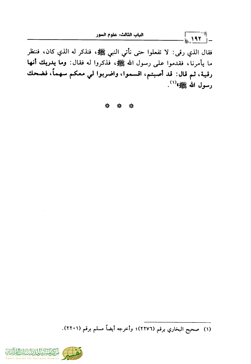 فقال الذي رقى: لا تفعلوا حتى نأتي النبي صلّى الله عليه وسلّم، فنذكر له الذي كان، فننظر ما يأمرنا، فقدموا على رسول الله صلّى الله عليه وسلّم، فذكروا له فقال: وما يدريك أنها رقية، ثم قال: قد أصبتم، اقسموا، واضربوا لي معكم سهماً، فضحك رسول الله صلّى الله عليه وسلّم» (¬1).
