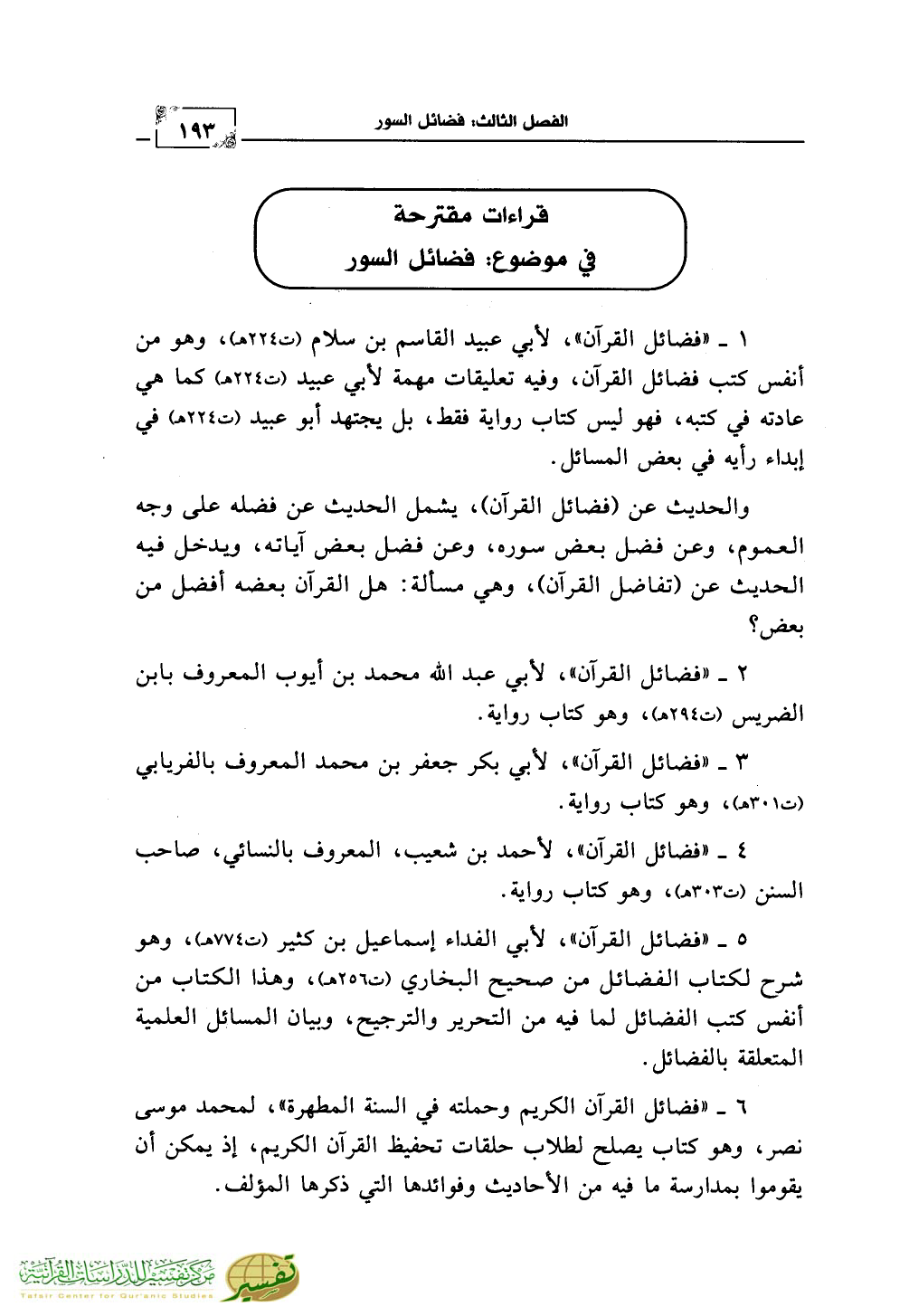 1 - «فضائل القرآن»، لأبي عبيد القاسم بن سلام (ت224هـ)، وهو من أنفس كتب فضائل القرآن، وفيه تعليقات مهمة لأبي عبيد (ت224هـ) كما هي عادته في كتبه، فهو ليس كتاب رواية فقط، بل يجتهد أبو عبيد (ت224هـ) في إبداء رأيه في بعض المسائل.