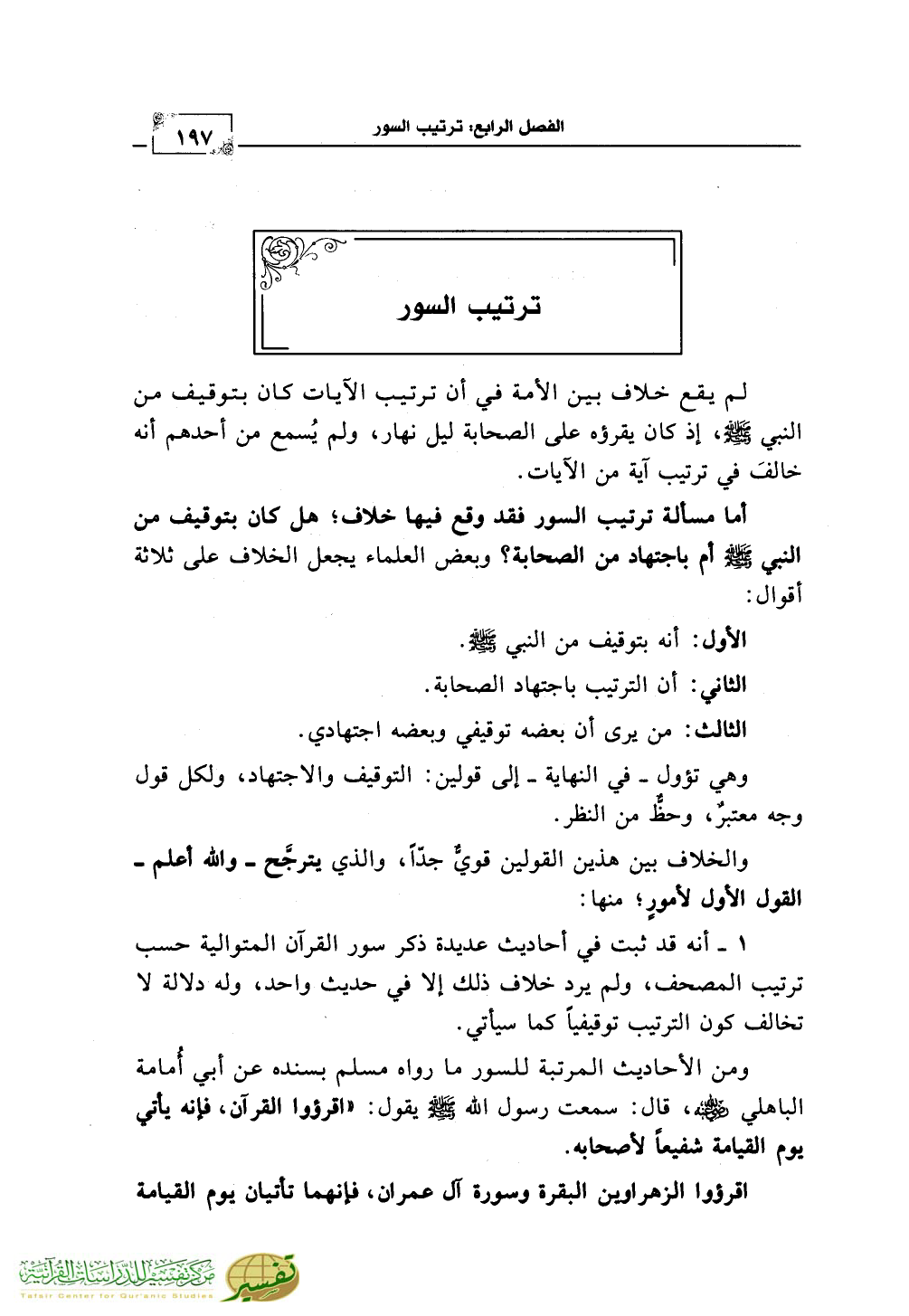 أما مسألة ترتيب السور فقد وقع فيها خلاف؛ هل كان بتوقيف من النبي صلّى الله عليه وسلّم أم باجتهاد من الصحابة؟ وبعض العلماء يجعل الخلاف على ثلاثة أقوال: