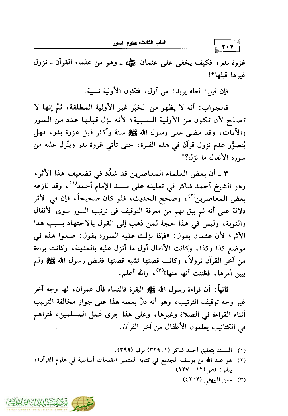 3 - أن بعض العلماء المعاصرين قد شدَّد في تضعيف هذا الأثر، وهو الشيخ أحمد شاكر في تعليقه على مسند الإمام أحمد (¬1)، وقد نازعه بعض المعاصرين (¬2)، وصحح الحديث، فلو كان صحيحاً، فإن في الأثر دلالة على أنه لم يبق لهم من معرفة التوقيف في ترتيب السور سوى الأنفال والتوبة، وليس في هذا حجة لمن ذهب إلى القول بالاجتهاد بسبب هذا الأثر؛ لأن عثمان يقول: «فإذا نزلت عليه السورة يقول: ضعوا هذه في موضع كذا وكذا، وكانت الأنفال أول ما أنزل عليه بالمدينة، وكانت براءة من آخر القرآن نزولاً، وكانت قصتها تشبه قصتها فقبض رسول الله صلّى الله عليه وسلّم ولم يبين أمرها، فظننت أنها منها» (¬3)، والله أعلم.