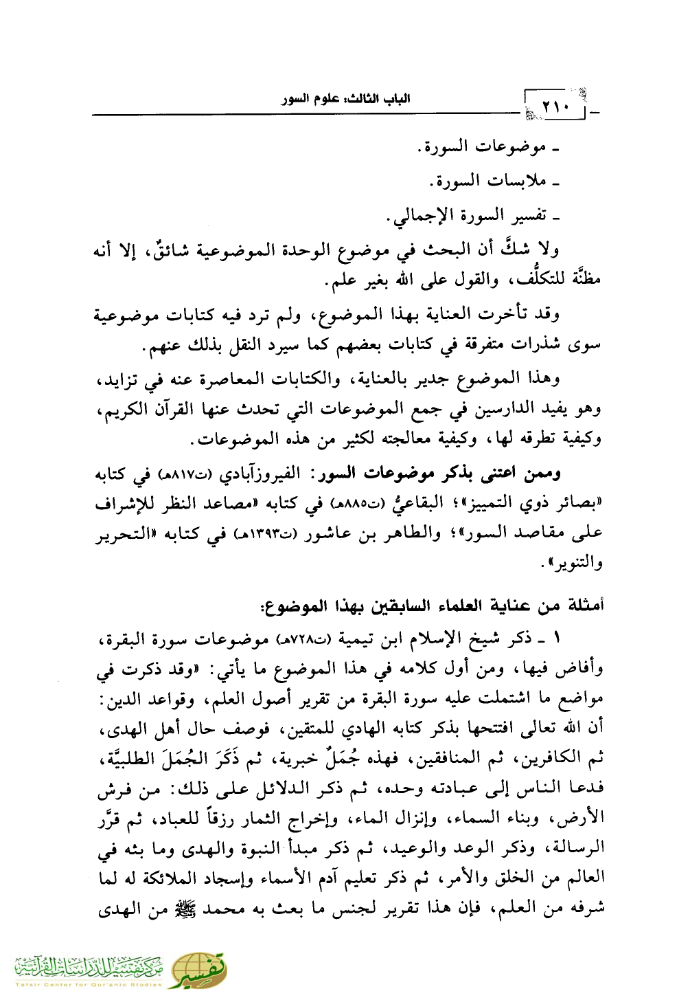 وممن اعتنى بذكر موضوعات السور: الفيروزآبادي (ت817هـ) في كتابه «بصائر ذوي التمييز»؛ البقاعيُّ (ت885هـ) في كتابه «مصاعد النظر للإشراف على مقاصد السور»؛ والطاهر بن عاشور (ت1393هـ) في كتابه «التحرير والتنوير».