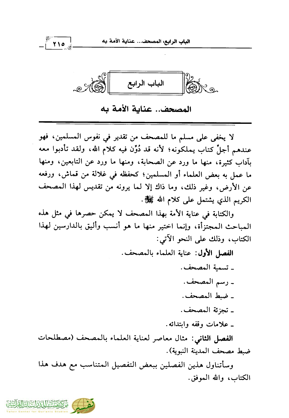 والكتابة في عناية الأمة بهذا المصحف لا يمكن حصرها في مثل هذه المباحث المجتزأة، وإنما اختير منها ما هو أنسب وأليق بالدارسين لهذا الكتاب، وذلك على النحو الآتي: