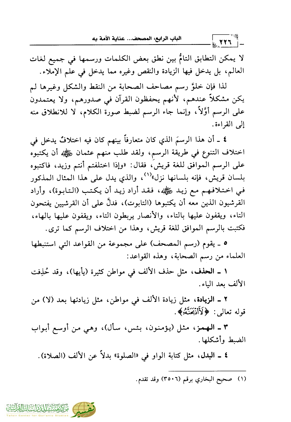 5 - يقوم (رسم المصحف) على مجموعة من القواعد التي استنبطها العلماء من رسم الصحابة، وهذه القواعد: