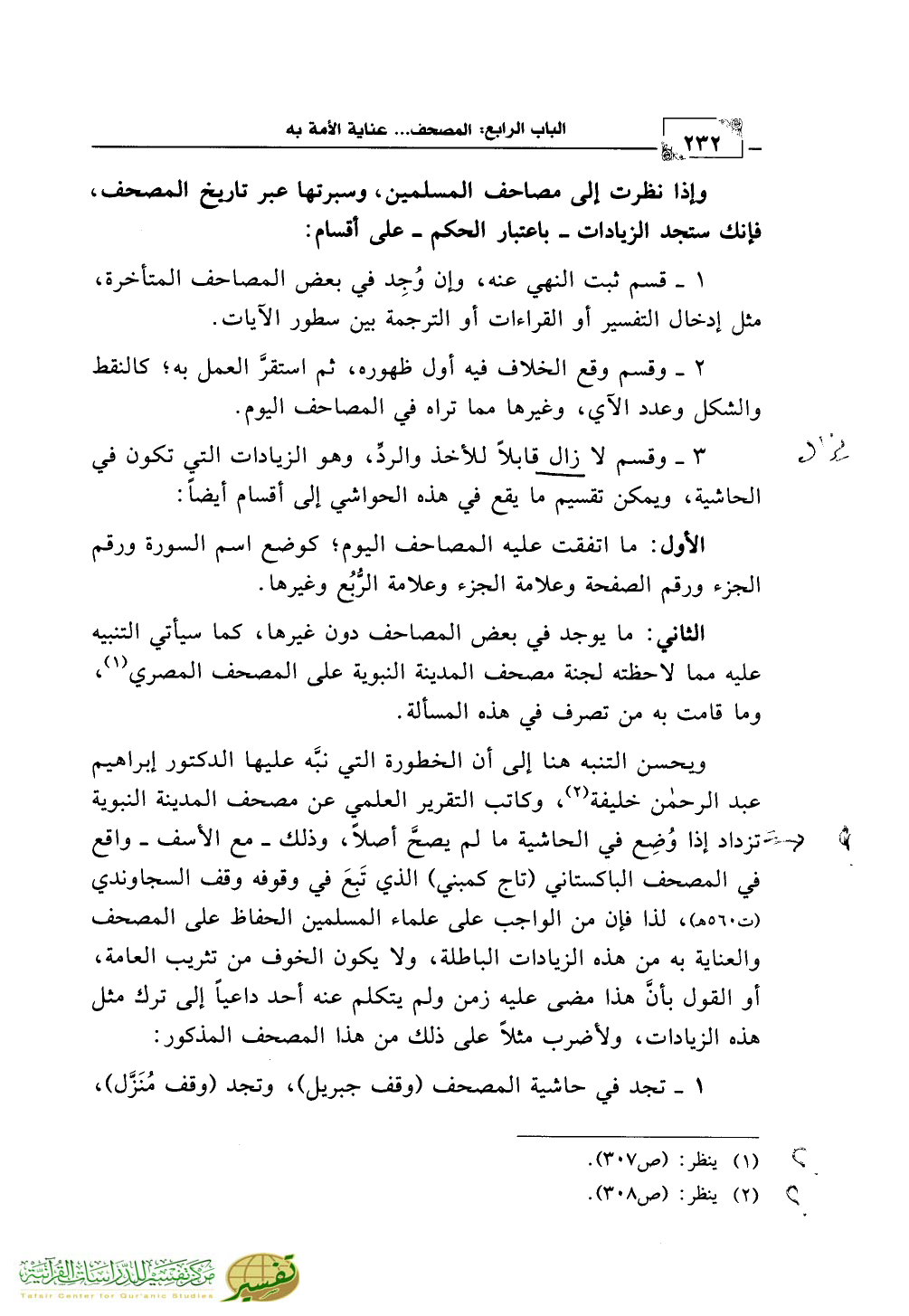 وإذا نظرت إلى مصاحف المسلمين، وسبرتها عبر تاريخ المصحف، فإنك ستجد الزيادات ـ باعتبار الحكم ـ على أقسام: