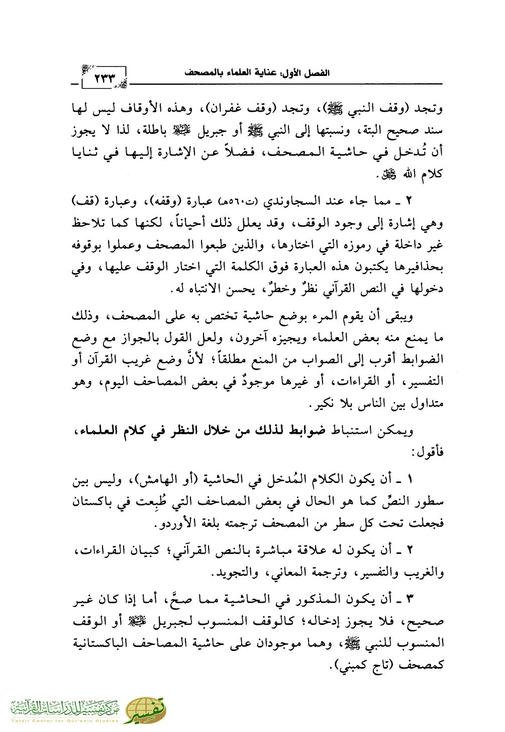 3 - أن يكون المذكور في الحاشية مما صحَّ، أما إذا كان غير صحيح، فلا يجوز إدخاله؛ كالوقف المنسوب لجبريل عليه السلام أو الوقف المنسوب للنبي صلّى الله عليه وسلّم، وهما موجودان على حاشية المصاحف الباكستانية كمصحف (تاج كمبني).