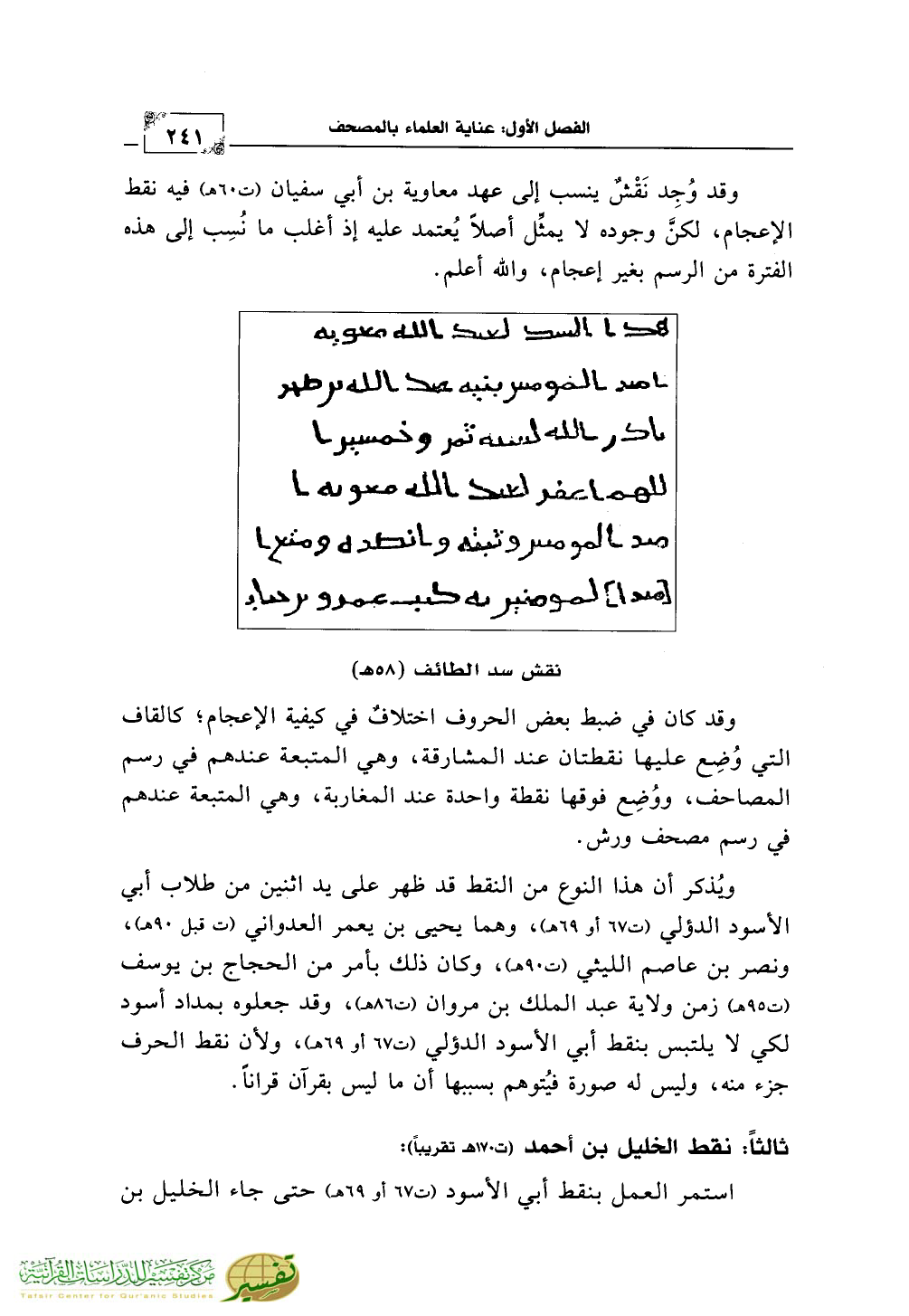 وقد وُجِد نَقْشٌ ينسب إلى عهد معاوية بن أبي سفيان (ت60هـ) فيه نقط الإعجام، لكنَّ وجوده لا يمثِّل أصلاً يُعتمد عليه إذ أغلب ما نُسِب إلى هذه الفترة من الرسم بغير إعجام، والله أعلم.