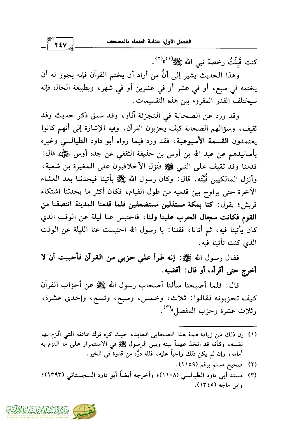 قال: فلما أصبحنا سألنا أصحاب رسول الله صلّى الله عليه وسلّم عن أحزاب القرآن كيف تحزبونه فقالوا: ثلاث، وخمس، وسبع، وتسع، وإحدى عشرة، وثلاث عشرة وحزب المفصل» (¬3).