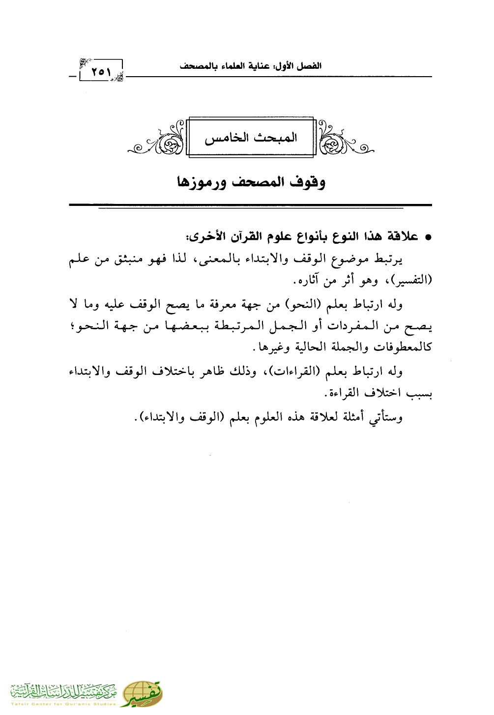 يرتبط موضوع الوقف والابتداء بالمعنى، لذا فهو منبثق من علم (التفسير)، وهو أثر من آثاره.