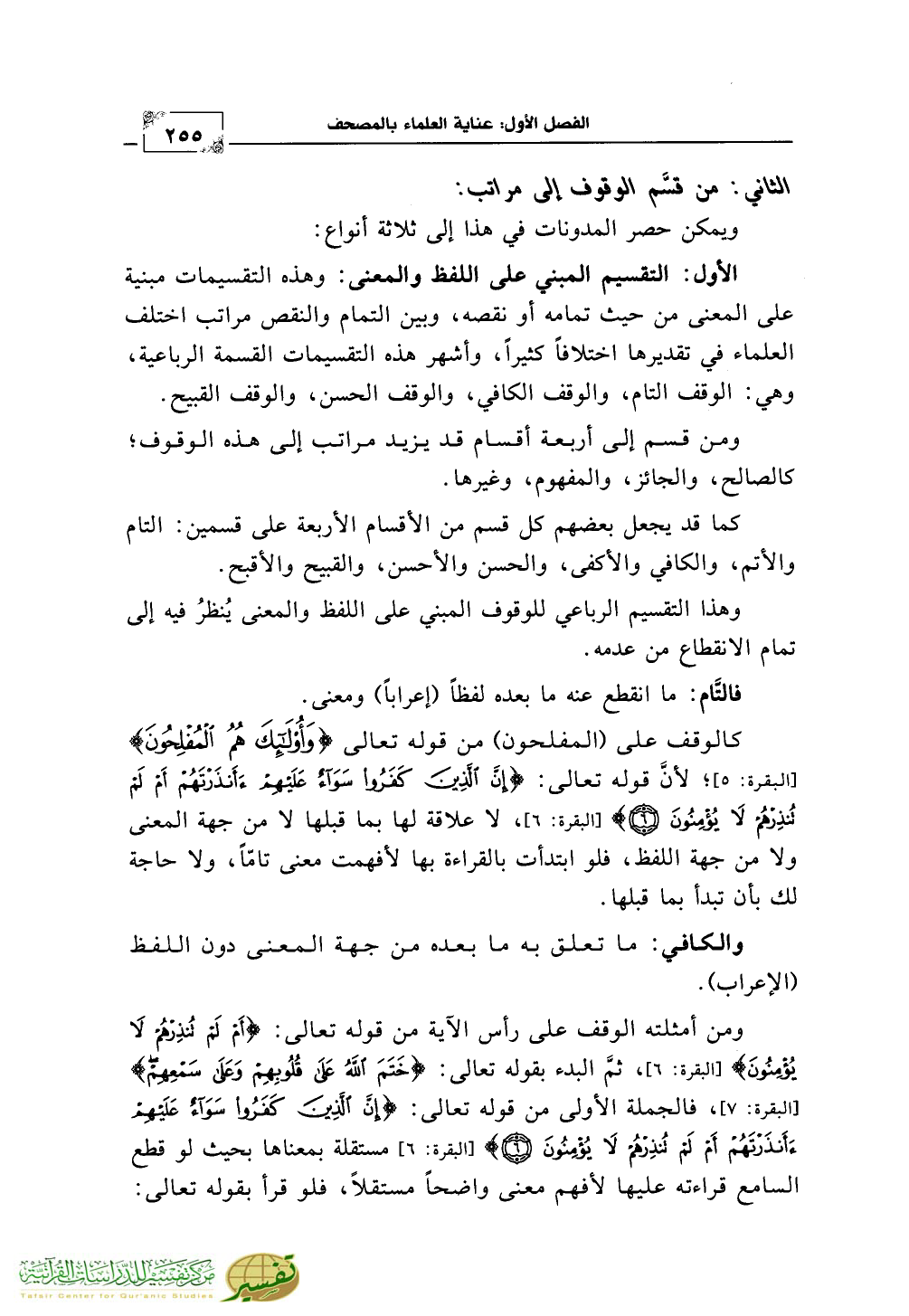 ومن أمثلته الوقف على رأس الآية من قوله تعالى: {أَمْ لَمْ تُنْذِرْهُمْ لاَ يُؤْمِنُونَ} [البقرة: 6]، ثمَّ البدء بقوله تعالى: {خَتَمَ اللَّهُ عَلَى قُلُوبِهِمْ وَعَلَى سَمْعِهِمْ} [البقرة: 7]، فالجملة الأولى من قوله تعالى: {إِنَّ الَّذِينَ كَفَرُوا سَوَاءٌ عَلَيْهِمْ أَأَنْذَرْتَهُمْ أَمْ لَمْ تُنْذِرْهُمْ لاَ يُؤْمِنُونَ} [البقرة: 6] مستقلة بمعناها بحيث لو قطع السامع قراءته عليها لأفهم معنى واضحاً مستقلاً، فلو قرأ بقوله تعالى: