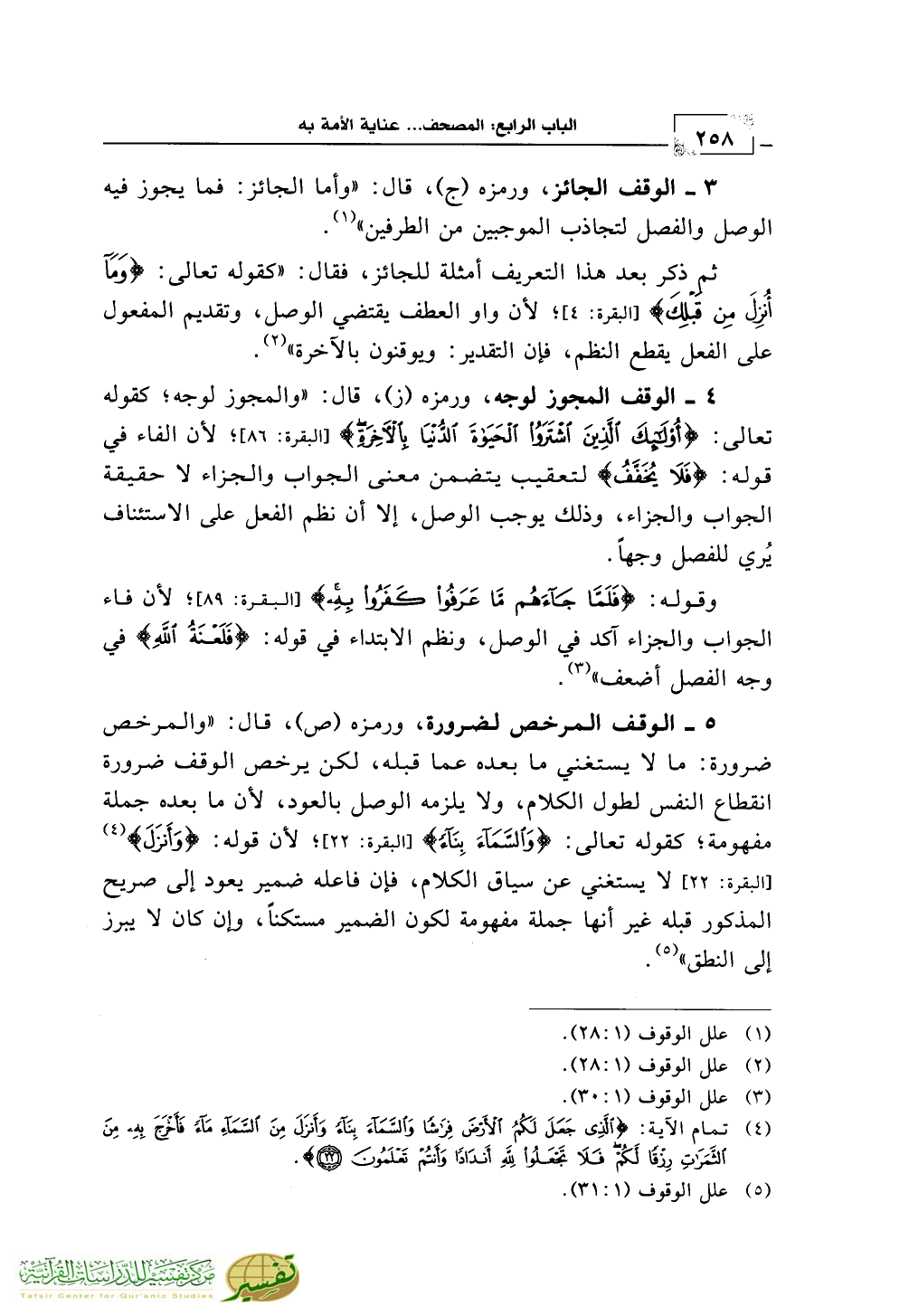 5 - الوقف المرخص لضرورة، ورمزه (ص)، قال: «والمرخص ضرورة: ما لا يستغني ما بعده عما قبله، لكن يرخص الوقف ضرورة انقطاع النفس لطول الكلام، ولا يلزمه الوصل بالعود، لأن ما بعده جملة مفهومة؛ كقوله تعالى: {وَالسَّمَاءَ بِنَاءً} [البقرة: 22]؛ لأن قوله: {وَأَنْزَلَ} (¬4) [البقرة: 22] لا يستغني عن سياق الكلام، فإن فاعله ضمير يعود إلى صريح المذكور قبله غير أنها جملة مفهومة لكون الضمير مستكناً، وإن كان لا يبرز إلى النطق» (¬5).