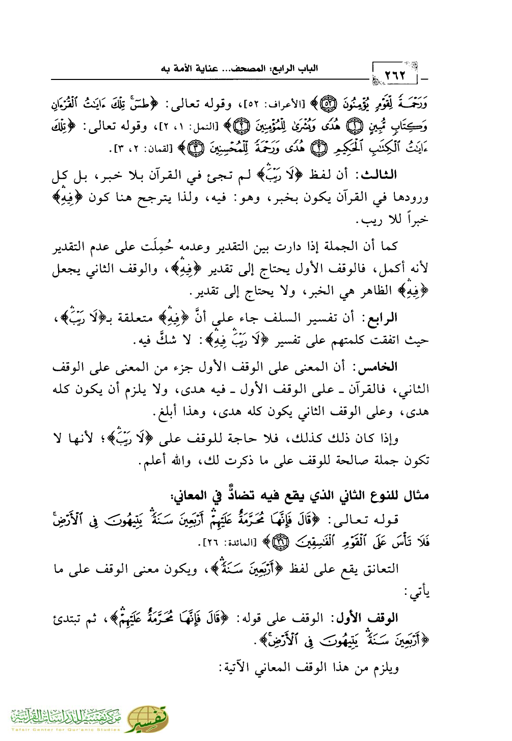 الخامس: أن المعنى على الوقف الأول جزء من المعنى على الوقف الثاني، فالقرآن ـ على الوقف الأول ـ فيه هدى، ولا يلزم أن يكون كله هدى، وعلى الوقف الثاني يكون كله هدى، وهذا أبلغ.