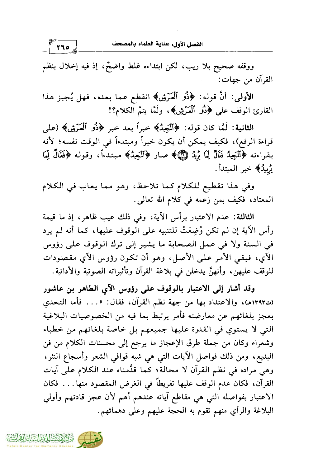 الثالثة: عدم الاعتبار برأس الآية، وفي ذلك عيب ظاهر، إذ ما قيمة رأس الآية إن لم تكن وُضِعَتْ للتنبيه على الوقوف عليها، كما أنه لم يرد في السنة ولا في عمل الصحابة ما يشير إلى ترك الوقوف على رؤوس الآي، فبقي الأمر على الأصل، وهو أن تكون رؤوس الآي مقصودات للوقف عليهن، وأنهنَّ يدخلن في بلاغة القرآن وتأثيراته الصوتية والأدائية.