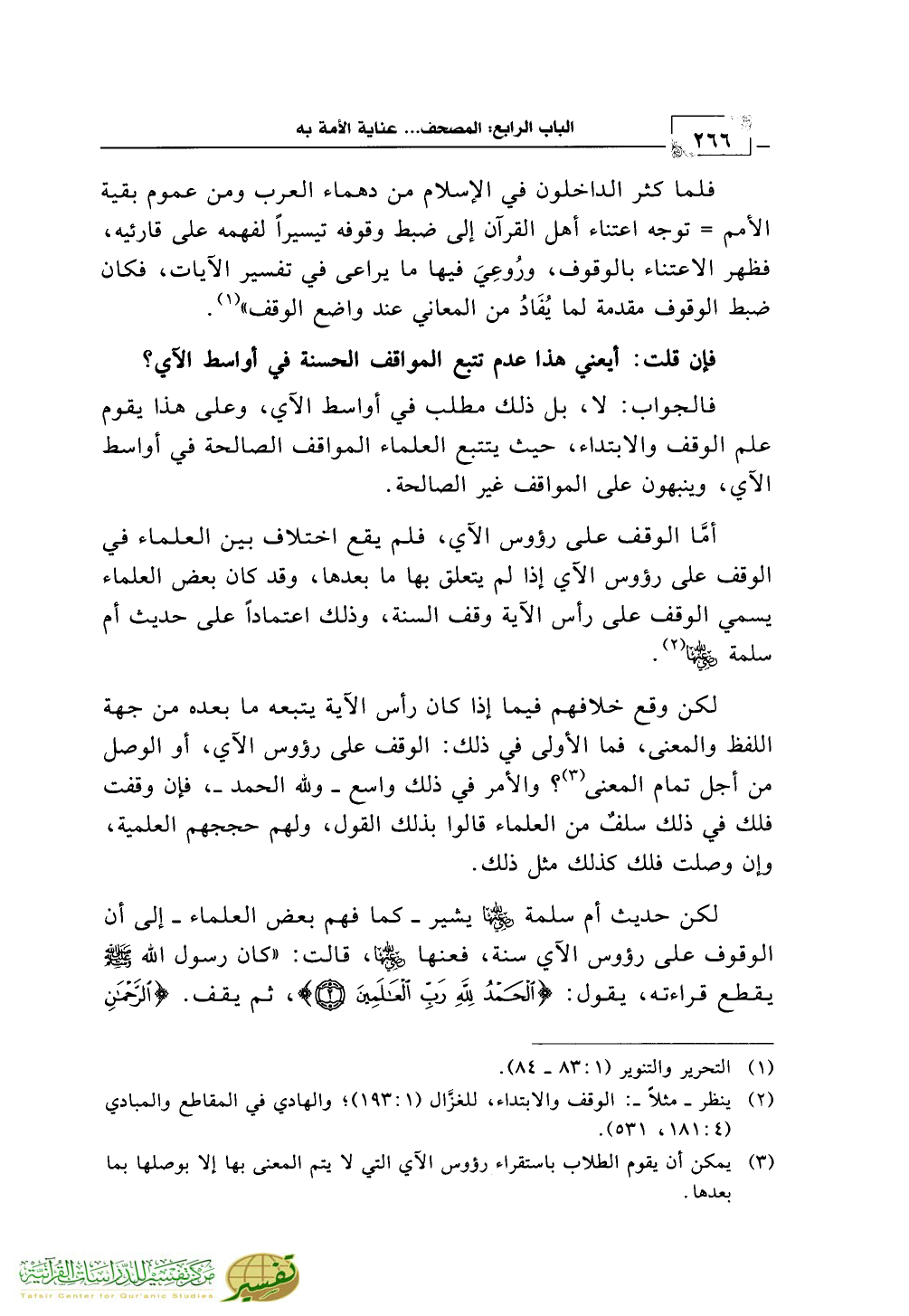 (¬2) ينظر ـ مثلاً ـ: الوقف والابتداء، للغزَّال (1:193)؛ والهادي في المقاطع والمبادي (4:181، 531).