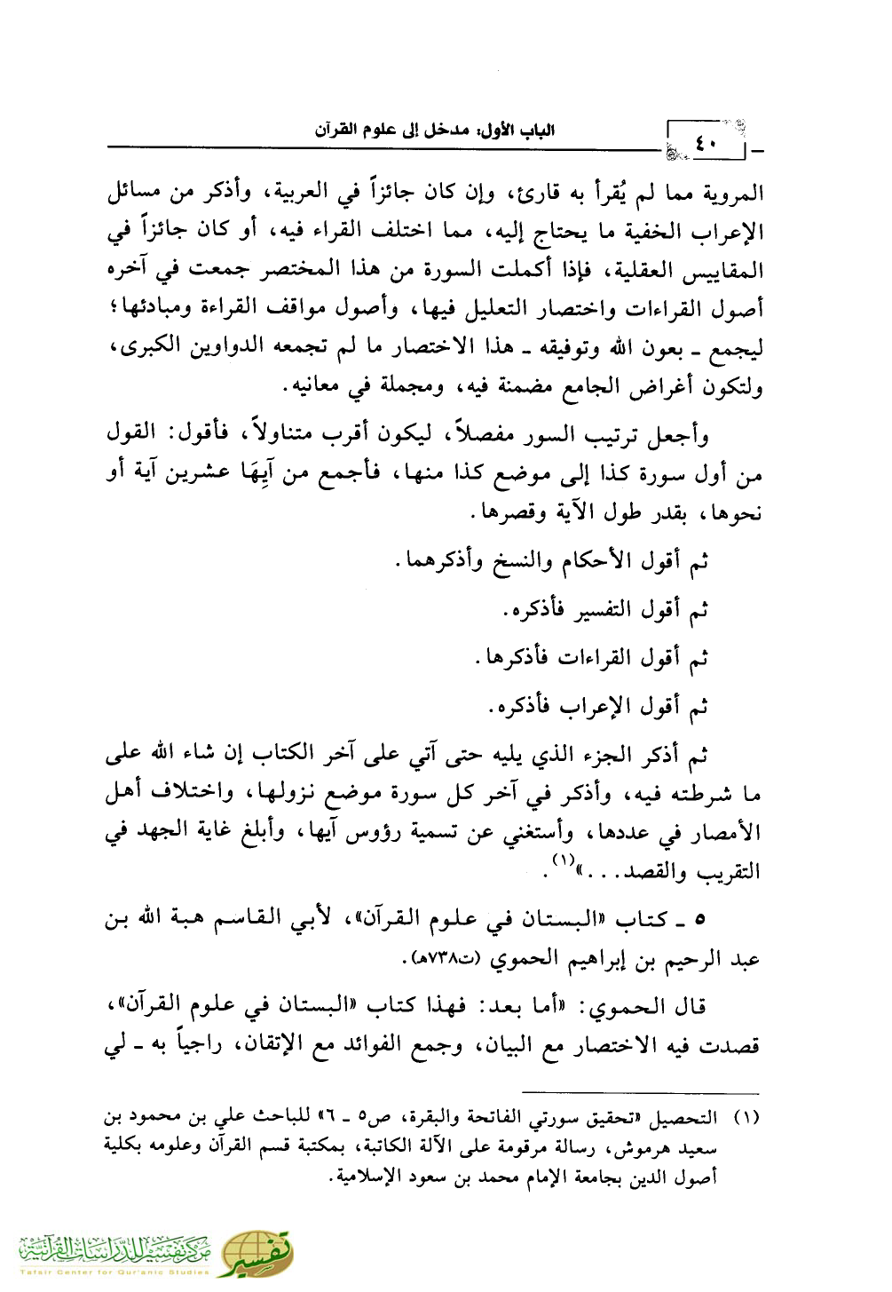 (¬1) التحصيل «تحقيق سورتي الفاتحة والبقرة، ص5 - 6» للباحث علي بن محمود بن سعيد هرموش، رسالة مرقومة على الآلة الكاتبة، بمكتبة قسم القرآن وعلومه بكلية أصول الدين بجامعة الإمام محمد بن سعود الإسلامية.