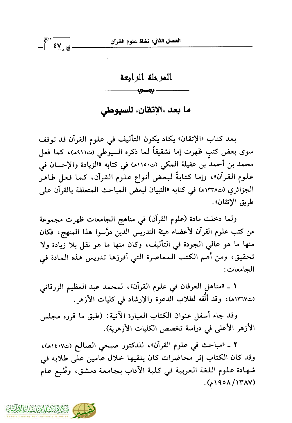 2 - «مباحث في علوم القرآن»، للدكتور صبحي الصالح (ت1407هـ)، وقد كان الكتاب إثر محاضرات كان يلقيها خلال عامين على طلابه في شهادة علوم اللغة العربية في كلية الآداب بجامعة دمشق، وطُبع عام (1387/ 1967م).