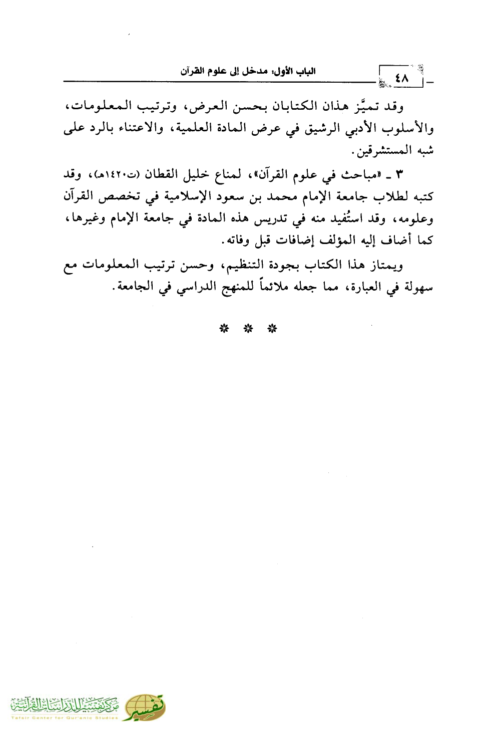 3 - «مباحث في علوم القرآن»، لمناع خليل القطان (ت1420هـ)، وقد كتبه لطلاب جامعة الإمام محمد بن سعود الإسلامية في تخصص القرآن وعلومه، وقد استُفيد منه في تدريس هذه المادة في جامعة الإمام وغيرها، كما أضاف إليه المؤلف إضافات قبل وفاته.