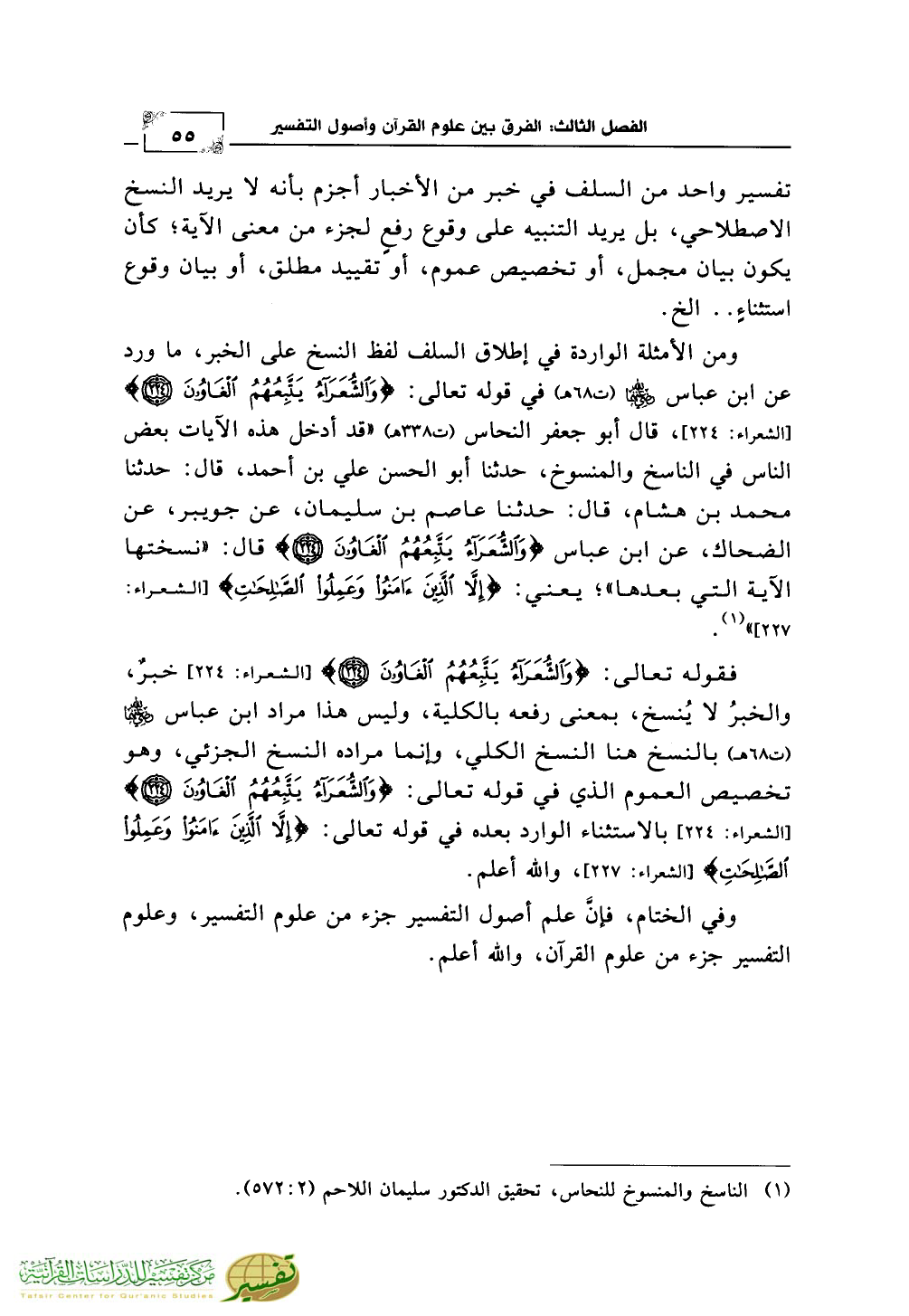 فقوله تعالى: {وَالشُّعَرَاءُ يَتَّبِعُهُمُ الْغَاوُونَ} [الشعراء: 224] خبرٌ، والخبرُ لا يُنسخ، بمعنى رفعه بالكلية، وليس هذا مراد ابن عباس رضي الله عنهما (ت68هـ) بالنسخ هنا النسخ الكلي، وإنما مراده النسخ الجزئي، وهو تخصيص العموم الذي في قوله تعالى: {وَالشُّعَرَاءُ يَتَّبِعُهُمُ الْغَاوُونَ} [الشعراء: 224] بالاستثناء الوارد بعده في قوله تعالى: {إِلاَّ الَّذِينَ آمَنُوا وَعَمِلُوا الصَّالِحَاتِ} [الشعراء: 227]، والله أعلم.