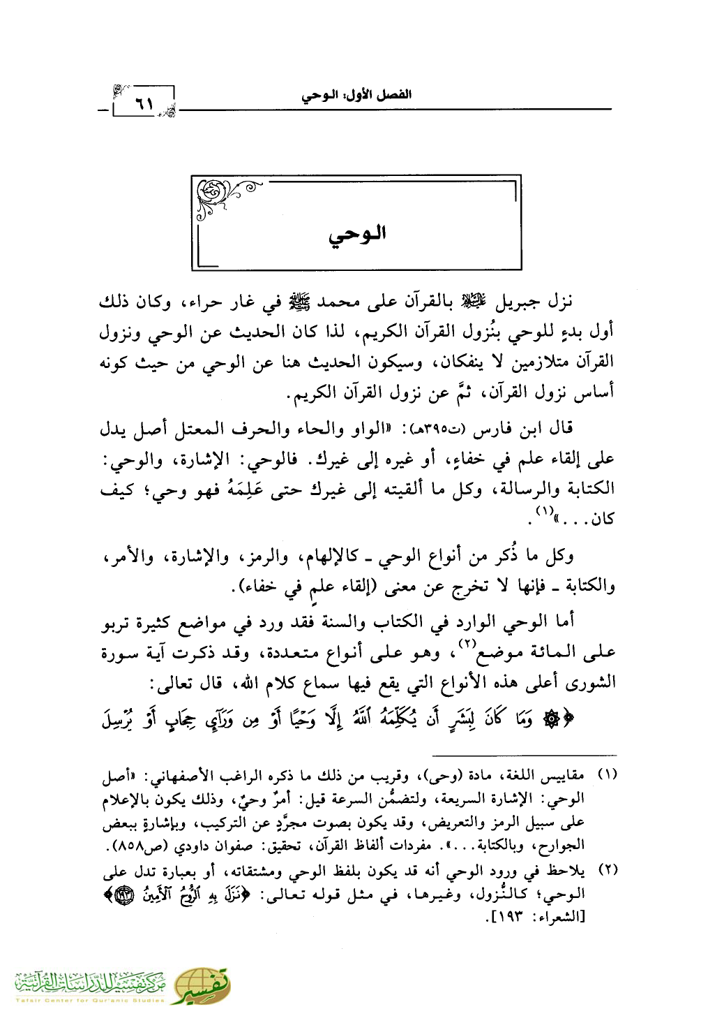 (¬1) مقاييس اللغة، مادة (وحى)، وقريب من ذلك ما ذكره الراغب الأصفهاني: «أصل الوحي: الإشارة السريعة، ولتضمُّن السرعة قيل: أمرٌ وحيٌ، وذلك يكون بالإعلام على سبيل الرمز والتعريض، وقد يكون بصوت مجرَّدٍ عن التركيب، وبإشارةٍ ببعض الجوارح، وبالكتابة ...». مفردات ألفاظ القرآن، تحقيق: صفوان داودي (ص858).