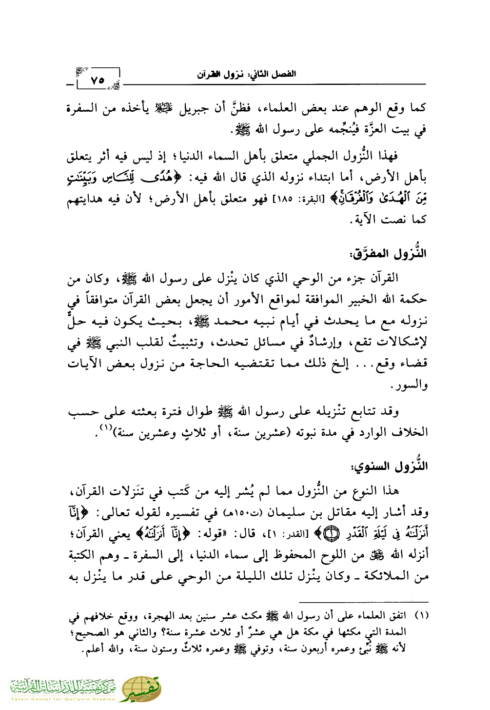 وقد تتابع تنْزيله على رسول الله صلّى الله عليه وسلّم طوال فترة بعثته على حسب الخلاف الوارد في مدة نبوته (عشرين سنة، أو ثلاثٍ وعشرين سنة) (¬1).